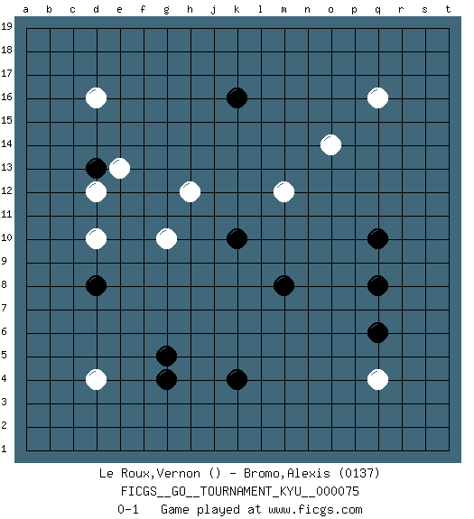 Last move : 0-1 2009 March 23 11:45:54 [Event "FICGS__GO__TOURNAMENT_KYU__000075 "] [Site "FICGS"] [Date "2009.02.04"] [Round "1"] [Black "Le Roux,Vernon "] [White "Bromo,Alexis "] [Result "0-1"] [Rating 2 "0137"] 1.g4 d4 2.g5 q16 3.k4 q4 4.q10 d16 5.k10 d10 6.k16 o14 7.d13 e13 8.q6 d12 9.q8 m12 10.m8 h12 11.d8 g10 0-1 This go game has been lost on time (started : 2009.02.04 9:32:17) Here are the names of the openings (joseki) played in the four corners : Corner d4 : g4 d4This joseki is unknown. A weak or weird move has probably been played in this corner. Corner d16 : d16 d13Hoshi (Hwajeom, Seongjeom, Xingwei`) 4-4 Point. The star or hoshi (4-4) point, emphasizing influence at the potential expense of territory.Nikken Takagakari (Dukan Nop'dakeolch'im, E`r Gaojia, 2-Space High Approach). Black 2 is a light approach move. Rarely played in even games, Black 2 is typically employed in handicap games. White continues with 6-4 or 3-10. In Korean Sunjang Baduk White has a stone on 8-4. Corner q4 : q4 q6Hoshi (Hwajeom, Seongjeom, Xingwei`) 4-4 Point. The star or hoshi (4-4) point, emphasizing influence at the potential expense of territory.Ikken Takagakari (Hankan Nop'dakeolch'im, Yi Gaojia, 1-Space High Approach). White typically responds at 6-4 or 3-10. White 4-10 is played when White finds play on the right side advantageous. White 4-8 or 3-8 may be played when White has support at top. Player White won this Go (weiqi, baduk) game.Follow this game move after move (download ) If there is no stone on the handicap point, the carpenter's square is dead. (Anonymous) Never risk one's whole fortune unless supported by one's entire army. (Niccolo Machiavelli)