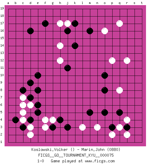 Last move : 1-0 2009 April 28 4:19:43 [Event "FICGS__GO__TOURNAMENT_KYU__000075"] [Site "FICGS"] [Date "2009.02.04"] [Round "1"] [Black "Koslowski,Volker"] [White "Marin,John"] [Result "1-0"] [Rating 2 "0880"] 1.d16 q17 2.d4 q3 3.q5 q8 4.o5 n3 5.m5 r12 6.j11 p12 7.e10 c7 8.d7 d8 9.e8 l3 10.j3 f4 11.g3 g4 12.h4 f3 13.c8 d2 14.p3 p2 15.r3 r2 16.k14 r4 17.o8 d6 18.d9 c6 19.e6 c4 20.c3 d3 21.b4 c5 22.m16 o16 23.o10 h17 24.f17 h14 25.j16 j17 26.k17 h12 27.e5 1-0 This go game has been lost on time (started : 2009.02.04 9:32:17) Here are the names of the openings (joseki) played in the four corners : Corner q4 : q3 q5 Komoku (Somok, Xiao~mu`) 3-4 Point. The komoku (3-4) point is the traditional corner enclosure move.. Ikken Takagakari (Hankan Nop'dakeolch'im, Yi Gaogua`jiao~, 1-Space High Approach). The 5-4 approach move has become more popular in modern times, as modern Go emphasizes speed and influence. Corner d4 : d4 c7 Hoshi (Hwajeom, Seongjeom, Xingwei`) 4-4 Point. The star or hoshi (4-4) point, emphasizing influence at the potential expense of territory. Nikken Kakari (Dukan Keolch'im, E`r Gua`jiao~, 2-Space Low Approach). Black typically answers by 7-3 or 3-5 (which is not joseki). Player Black won this Go (weiqi, baduk) game. Follow this game move after move (download)You have to like to win, and to learn to recognize the errors that gave you the victory. (Pierre Audouard) God is an atheist. (Unknown)