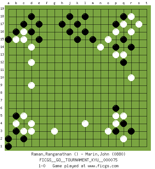 Last move : 1-0 2009 May 13 5:48:53 [Event "FICGS__GO__TOURNAMENT_KYU__000075 "] [Site "FICGS"] [Date "2009.02.04"] [Round "1"] [Black "Raman,Ranganathan "] [White "Marin,John "] [Result "1-0"] [Rating 2 "0880"] 1.q4 d3 2.c2 c16 3.c17 r16 4.r17 c3 5.a2 k16 6.a1 g3 7.k17 d17 8.d18 q17 9.q18 j17 10.j18 r18 11.d16 c15 12.e17 s17 13.b3 o3 14.l18 l4 15.j16 d12 16.l16 b4 17.k15 p5 18.c4 c5 19.b5 d4 20.p17 p16 21.q15 d9 22.h17 q2 23.b16 q5 24.p6 b15 25.a15 q13 26.r3 p4 27.p3 r10 28.e15 o15 29.p14 n14 30.m15 d14 31.r14 p13 32.q12 1-0 This go game has been lost on time (started : 2009.02.04 9:32:17) Here are the names of the openings (joseki) played in the four corners : Corner d4 : d3 c2Komoku (Somok, Xiao~mu`) 3-4 Point. The komoku (3-4) point is the traditional corner enclosure move.. Corner d16 : c16 c17Komoku (Somok, Xiao~mu`) 3-4 Point. The komoku (3-4) point is the traditional corner enclosure move..This is not joseki. n invasion to take the corner after White made a shimari-less moyo on top disabling the other moves. Corner q16 : r16 r17Komoku (Somok, Xiao~mu`) 3-4 Point. The komoku (3-4) point is the traditional corner enclosure move..This is not joseki. n invasion to take the corner after White made a shimari-less moyo on top disabling the other moves. Corner q4 : q4 o3Hoshi (Hwajeom, Seongjeom, Xingwei`) 4-4 Point. The star or hoshi (4-4) point, emphasizing influence at the potential expense of territory.Ikken Kakari (Hankan Keolch'im, Yi Gua`jiao~, 1-Space Low Approach). White 2 is the standard approach move to the 4-4. Player Black won this Go (weiqi, baduk) game.Follow this game move after move (download ) The L-group is dead. (Anonymous) Everybody lies. (Gregory House, House M.D.)