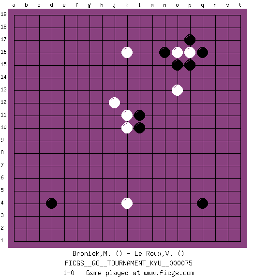 Last move : 1-0 2009 March 23 11:45:54 [Event "FICGS__GO__TOURNAMENT_KYU__000075"] [Site "FICGS"] [Date "2009.02.04"] [Round "1"] [Black "Broniek,Mariusz Maciej"] [White "Le Roux,Vernon"] [Result "1-0"] 1.q16 k16 2.q4 k10 3.d4 p16 4.p15 o16 5.o15 o13 6.n16 k11 7.l11 j12 8.l10 k4 9.p17 1-0 This go game has been lost on time (started : 2009.02.04 9:32:17) Here are the names of the openings (joseki) played in the four corners : Corner q16 : q16 p16 Hoshi (Hwajeom, Seongjeom, Xingwei`) 4-4 Point. The star or hoshi (4-4) point, emphasizing influence at the potential expense of territory. Corner q4 : q4 1-0 Hoshi (Hwajeom, Seongjeom, Xingwei`) 4-4 Point. The star or hoshi (4-4) point, emphasizing influence at the potential expense of territory. Player Black won this Go (weiqi, baduk) game. Follow this game move after move (download)With less than 15 stones in danger, tenuki. (Anonymous) A person who never made a mistake never tried anything new. (Albert Einstein)