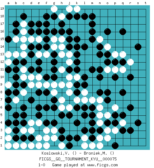 Last move : 1-0 2009 November 15 18:24:40 [Event "FICGS__GO__TOURNAMENT_KYU__000075"] [Site "FICGS"] [Date "2009.02.04"] [Round "1"] [Black "Koslowski,Volker"] [White "Broniek,Mariusz Maciej"] [Result "1-0"] 1.d16 q4 2.q16 d4 3.c6 k10 4.m5 l5 5.m6 m7 6.l6 l7 7.k6 k5 8.j5 j6 9.h3 j4 10.h5 k7 11.j7 h6 12.g7 h7 13.g6 j8 14.h8 h9 15.j7 g8 16.j14 h7 17.p10 n6 18.m15 n7 19.e8 n5 20.m4 n4 21.r10 m3 22.l3 l2 23.m2 k3 24.n3 l4 25.k4 j6 26.d13 l4 27.l5 g5 28.s14 h4 29.g4 j3 30.f4 f5 31.e5 g3 32.h2 g2 33.k2 h1 34.j2 f3 35.d2 f7 36.f8 h6 37.f6 e7 38.d7 f9 39.g10 e9 40.e6 o3 41.g12 n2 42.d17 g9 43.e11 l1 44.m3 o2 45.e3 e2 46.e1 f2 47.o16 d10 48.r6 c11 49.q8 k16 50.h17 j17 51.h16 k17 52.k15 h15 53.m17 l17 54.m18 l15 55.l14 l16 56.j16 h18 57.g18 g17 58.g16 f17 59.f18 f16 60.j15 g15 61.f15 e15 62.f14 f13 63.e14 h13 64.s4 j13 65.k13 h14 66.k14 m14 67.k12 j12 68.j11 h11 69.k11 j10 70.g11 l11 71.e16 l13 72.e17 d15 73.n10 l12 74.n14 m13 75.r3 n15 76.m16 o14 77.n13 n12 78.o13 p13 79.o12 o11 80.p12 p11 81.q12 q13 82.n11 m12 83.l10 f16 84.f17 g14 85.l9 e13 86.d14 c15 87.q5 r12 88.m11 q11 89.p4 m1 90.o4 o5 91.q3 p3 92.p5 d3 93.c2 c3 94.b2 e4 95.b3 f1 96.b9 d1 97.k9 j9 98.a11 b4 99.k8 l8 100.c5 a1 101.b12 a3 102.c4 c1 103.b5 a5 104.a6 a2 105.a4 e1 106.j1 b1 107.b4 n1 108.p1 d12 109.o8 c13 110.c12 c14 111.f16 c16 112.b17 d9 113.d11 c10 114.b10 c8 115.f10 e10 116.b8 b7 117.c9 b13 118.g13 a13 119.b11 a12 120.b16 a8 121.n8 a9 122.e12 a10 123.a7 c17 124.c18 p6 125.o7 g19 126.j18 j19 127.k18 k19 128.l18 b15 129.a15 a9 130.a8 1-0 Here are the names of the openings (joseki) played in the four corners : Corner d4 : d4 c6 Hoshi (Hwajeom, Seongjeom, Xingwei`) 4-4 Point. The star or hoshi (4-4) point, emphasizing influence at the potential expense of territory. Ikken Kakari (Hankan Keolch'im, Yi Gua`jiao~, 1-Space Low Approach). Black 2 is the standard approach move to the 4-4. Corner q4 : q4 m5 Hoshi (Hwajeom, Seongjeom, Xingwei`) 4-4 Point. The star or hoshi (4-4) point, emphasizing influence at the potential expense of territory. Player Black won this Go (weiqi, baduk) game. Follow this game move after move (download)Studying go is a wonderful way to develop both the creative as well as the logical abilities of children because to play it both sides of the brain are necessary. (Cho Chikun) Computers have lots of memory but no imagination. (Anonymous)