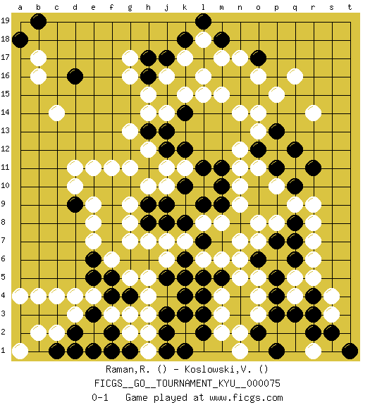 Last move : 0-1 2009 October 19 21:32:33 [Event "FICGS__GO__TOURNAMENT_KYU__000075"] [Site "FICGS"] [Date "2009.02.04"] [Round "1"] [Black "Raman,Ranganathan"] [White "Koslowski,Volker"] [Result "0-1"] 1.d16 q4 2.k4 q16 3.k10 d4 4.q10 m6 5.c3 h4 6.t1 m15 7.m16 g11 8.n16 l16 9.l17 o11 10.o12 n11 11.m11 n12 12.p11 o13 13.o10 n10 14.p9 n9 15.p13 g7 16.n8 m8 17.q12 h14 18.m9 n7 19.r11 o8 20.a18 k17 21.k16 l15 22.l7 l6 23.l5 l18 24.k18 m17 25.k6 k7 26.j5 j7 27.k8 e9 28.j9 h5 29.h8 h7 30.h6 m3 31.m18 l8 32.l9 d3 33.f8 c4 34.f10 n17 35.l11 e8 36.d2 g8 37.g6 e2 38.h9 f11 39.f9 j11 40.g10 j6 41.b19 r7 42.j8 c14 43.f7 k5 44.j3 d11 45.g4 f6 46.k12 g16 47.h11 h12 48.d1 h10 49.e10 d10 50.e6 g5 51.l19 j16 52.l17 o16 53.n15 n14 54.o15 p15 55.o17 o14 56.j17 e11 57.d9 e7 58.f5 g9 59.h16 g3 60.f4 j10 61.k6 k15 62.j15 j14 63.h13 g13 64.e3 f3 65.f2 g2 66.e1 c2 67.b3 b2 68.a2 b4 69.a3 a4 70.c1 a1 71.g1 e4 72.e5 e2 73.f1 h2 74.j13 g17 75.j2 h1 76.j1 k5 77.l4 h15 78.k14 j16 79.j12 k17 80.e3 h3 81.k6 l18 82.h17 b16 83.m5 o5 84.k5 k2 85.l2 m2 86.l3 n5 87.n4 m4 88.n3 n2 89.o2 o3 90.p3 o4 91.p1 k11 92.q3 b17 93.k3 n1 94.o6 q5 95.p5 n6 96.k1 s3 97.p4 p8 98.o9 r14 99.m10 q9 100.q8 r9 101.p7 p10 102.q6 r6 103.q7 r8 104.r4 r5 105.r3 s4 106.s2 r1 107.r2 o7 0-1 This go game has been lost on time (started : 2009.02.04 9:32:17) Here are the names of the openings (joseki) played in the four corners : Corner d4 : d4 c3 Hoshi (Hwajeom, Seongjeom, Xingwei`) 4-4 Point. The star or hoshi (4-4) point, emphasizing influence at the potential expense of territory. Corner d16 : d16 g11 Hoshi (Hwajeom, Seongjeom, Xingwei`) 4-4 Point. The star or hoshi (4-4) point, emphasizing influence at the potential expense of territory. Player White won this Go (weiqi, baduk) game. Follow this game move after move (download)Keshi is worth as much as an invasion ! (Anonymous) To steal ideas from one person is plagiarism. To steal from many is research. (Unknown)