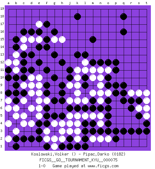 Last move : 1-0 2009 April 10 17:40:33 [Event "FICGS__GO__TOURNAMENT_KYU__000075"] [Site "FICGS"] [Date "2009.02.04"] [Round "1"] [Black "Koslowski,Volker"] [White "Pipac,Darko"] [Result "1-0"] [Rating 2 "0182"] 1.d16 q4 2.q16 d4 3.c6 d10 4.b4 c4 5.h8 n10 6.m6 e6 7.h5 k4 8.j11 k10 9.q9 h10 10.m4 k5 11.j10 j9 12.h9 k9 13.g10 h11 14.h12 g11 15.f11 g12 16.g13 f12 17.e12 f13 18.f14 e13 19.d13 k11 20.e14 e10 21.f5 e5 22.p12 b5 23.o4 b3 24.k6 k7 25.r3 q5 26.q3 r4 27.q7 p5 28.n12 o11 29.o5 q6 30.r6 s6 31.s7 t6 32.m15 d6 33.o7 c7 34.o12 n11 35.p11 b6 36.l6 k8 37.j6 h4 38.m12 m11 39.k18 l12 40.q18 r5 41.r7 j4 42.f4 f3 43.g3 g4 44.e3 f2 45.e2 g2 46.e4 h3 47.g5 e1 48.l3 j5 49.c11 h6 50.d2 d1 51.c2 a4 52.j2 h2 53.l2 g6 54.f6 f7 55.g7 c5 56.b9 j7 57.h7 l7 58.o9 n9 59.l10 l11 60.f8 e7 61.b8 e8 62.f9 e9 63.c10 c9 64.c8 d9 65.b7 a7 66.a8 a6 67.d11 d8 68.a10 b11 69.a11 b12 70.b10 a12 71.c12 b13 72.b14 c14 73.b15 c15 74.c16 d15 75.c13 e15 76.f17 f16 77.g16 e17 78.e16 g15 79.f15 h15 80.o10 m10 81.l13 j3 82.k1 k3 83.h1 g1 84.j1 k2 85.l1 c1 86.b2 a2 87.b1 m5 88.l4 l5 89.m7 m8 90.l9 o8 91.k13 n7 92.n6 n8 93.p8 p6 94.o6 p7 95.s5 s4 96.s3 t5 97.t3 t7 98.t4 s8 99.p9 n4 100.n3 n5 101.f1 r8 102.q8 p4 103.p3 o2 104.o3 n2 105.p2 m2 106.m3 t8 107.s5 pass 108.pass 1-0 Here are the names of the openings (joseki) played in the four corners : Corner d4 : d4 c6 Hoshi (Hwajeom, Seongjeom, Xingwei`) 4-4 Point. The star or hoshi (4-4) point, emphasizing influence at the potential expense of territory. Ikken Kakari (Hankan Keolch'im, Yi Gua`jiao~, 1-Space Low Approach). Black 2 is the standard approach move to the 4-4. Corner q4 : q4 m6 Hoshi (Hwajeom, Seongjeom, Xingwei`) 4-4 Point. The star or hoshi (4-4) point, emphasizing influence at the potential expense of territory. Player Black won this Go (weiqi, baduk) game. Follow this game move after move (download)Nothing requires doing this or that, but necessity exists. (Pierre Audouard) Chess is everything: art, science and sport. (Anatoly Karpov)