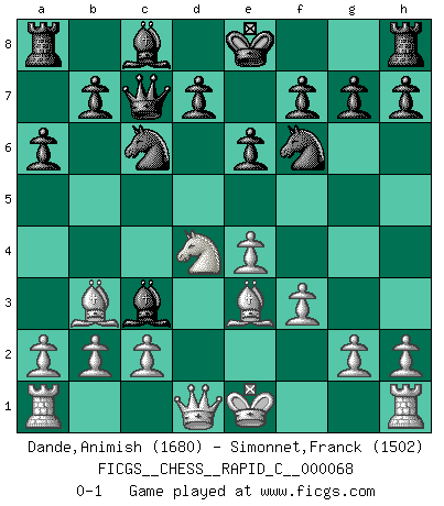 Last move : 0-1 2009 March 28 0:9:4 [Event "FICGS__CHESS__RAPID_C__000068"] [Site "FICGS"] [Date "2009.02.05"] [Round "1"] [White "Dande,Animish"] [Black "Simonnet,Franck"] [Result "0-1"] [WhiteElo "1680"] [BlackElo "1502"] 1.e4 c5 2.Nf3 e6 3.d4 cxd4 4.Nxd4 Nc6 5.Nc3 Qc7 6.Bc4 a6 7.Bb3 Bb4 8.f3 Nf6 9.Be3 Bxc3+ 0-1 This chess game has been lost on time (started : 2009.02.05 10:11:3) Sicilian : Taimanov (Bastrikov) variation Player Black won this chess game. Follow this game move after move (download)All I want to do, ever, is just play Chess. (Bobby Fischer) Wenn Capablanka heute auf der Schachbühne erscheinen würde, hätte er ein halbes Jahr gebraucht um sich die Schachtheorie anzueignen. Und dann hätte er alles und jeden besiegt. (Mikhail Moiseyevich Botvinik) No puedes jugar al Ajedrez si eres de corazón noble. (Proverbio Francés) On est toujours la mazette de quelqu'un d'autre. (Anonyme) The only sure thing about luck is that it will change. (Wilson Mizner)