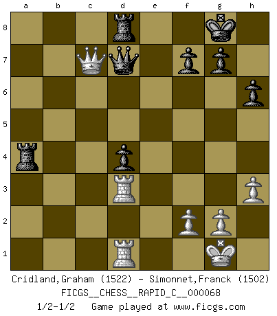 Last move : 1/2-1/2 2009 March 3 1:29:10 [Event "FICGS__CHESS__RAPID_C__000068"] [Site "FICGS"] [Date "2009.02.05"] [Round "1"] [White "Cridland,Graham"] [Black "Simonnet,Franck"] [Result "1/2-1/2"] [WhiteElo "1522"] [BlackElo "1502"] 1.e4 c5 2.Nf3 e6 3.d4 cxd4 4.Nxd4 Nc6 5.Nc3 Qc7 6.Be2 a6 7.Be3 Nf6 8.O-O Bb4 9.Na4 b5 10.Nxc6 Qxc6 11.Nb6 Rb8 12.Nxc8 Rxc8 13.c3 Bc5 14.Bxc5 Qxc5 15.Qd3 O-O 16.Rfd1 d5 17.exd5 Nxd5 18.Bf3 Rfd8 19.Qe2 a5 20.a4 b4 21.Bxd5 exd5 22.Qb5 bxc3 23.bxc3 Qxc3 24.Rab1 d4 25.Rd3 Qc2 26.Rbd1 h6 27.h3 Qc4 28.Qxa5 Ra8 29.Qb5 Rxa4 30.Qe5 Qd5 31.Qc7 Qd7 1/2-1/2 Sicilian : Taimanov (Bastrikov) variation Kingside Castling by player White (move 8) Kingside Castling by player Black (move 15) This chess game ended in a draw. Follow this game move after move (download)Every Chess master was once a beginner. (Chernev) Den Ruhm habe ich schon, jetzt brauche ich noch das Geld. (Wilhelm Steinitz) El Ajedrez es realmente noventa y nueve por ciento calculación. (Soltis) Le thème de l'attaque double intervient d'une manière ou d'une autre dans l'immense majorité des combinaisons. (Youri Averbakh) The mind is like a parachute, it only functions when its open. (Unknown)
