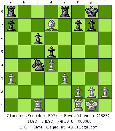 Last move : 1-0 2009 February 23 15:28:30 [Event "FICGS__CHESS__RAPID_C__000068"] [Site "FICGS"] [Date "2009.02.05"] [Round "1"] [White "Simonnet,Franck"] [Black "Farr,Johannes"] [Result "1-0"] [WhiteElo "1502"] [BlackElo "1525"] 1.d4 d5 2.c4 e6 3.Nc3 Nf6 4.cxd5 exd5 5.Bg5 Be7 6.e3 O-O 7.Bd3 c6 8.Nf3 Nbd7 9.O-O Ne8 10.Bxe7 Qxe7 11.Qc2 Nef6 12.Rac1 Re8 13.a3 Nf8 14.b4 Bg4 15.Ne5 Be6 16.Na4 N8d7 17.Nxd7 Qxd7 18.Nc5 Qe7 19.Qa4 Nd7 20.Nxe6 Qxe6 21.b5 Nb6 22.Qc2 cxb5 23.Bxh7+ Kf8 24.Bf5 Qf6 25.Qc5+ Kg8 26.Bh3 Nc4 27.Qxb5 Qc6 28.Qxc6 bxc6 29.Bd7 1-0 QGD : Exchange, positional line Kingside Castling by player Black (move 6) Kingside Castling by player White (move 9) Player White won this chess game. Follow this game move after move (download)It is the aim of the modern school, not to treat every position according to one general law, but according to the principle inherent in the position. (Richard Reti) Darum geht es im Schach. Einen Tag gibst du deinem Gegner eine Lektion, am nächsten Tag gibt er dir eine. (Robert James Fischer) El Ajedrez detiene a su maestro dentro de sus propios vínculos, encadenando la mente y el cerebro, por lo que la libertad interior del mas fuerte debe sufrir. (Albert Einstein) Le moment que je préfère le plus dans une rencontre, c'est celui où je sens que la personnalité de l'adversaire se brise. (Robert Fischer) Who needs drugs and alcohol if he can play Big Chess at FICGS ? (Heinz-Georg Lehnhoff)