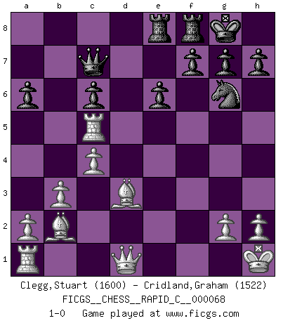 Last move : 1-0 2009 February 17 17:54:4 [Event "FICGS__CHESS__RAPID_C__000068"] [Site "FICGS"] [Date "2009.02.05"] [Round "1"] [White "Clegg,Stuart"] [Black "Cridland,Graham"] [Result "1-0"] [WhiteElo "1600"] [BlackElo "1522"] 1.e4 c5 2.Nf3 Nc6 3.d4 cxd4 4.Nxd4 e6 5.Nc3 Qc7 6.Be2 a6 7.Be3 Nf6 8.O-O Bb4 9.Na4 Be7 10.Nxc6 bxc6 11.Nb6 Rb8 12.Nxc8 Qxc8 13.e5 Nd5 14.Bc1 Qc7 15.c4 Nb6 16.f4 Nc8 17.b3 O-O 18.Bb2 Bc5+ 19.Kh1 Ne7 20.Bd3 Ng6 21.f5 exf5 22.Rxf5 Rbe8 23.e6 dxe6 24.Rxc5 1-0 Sicilian defense Kingside Castling by player White (move 8) Kingside Castling by player Black (move 17) Player White won this chess game. Follow this game move after move (download)We cannot resist the fascination of sacrifice, since a passion for sacrifices is part of a Chessplayer's nature. (Rudolf Spielman) Das Schach hält seine Meister in eigenen Banden, Fesseln; auf vielerlei Weise formt es ihren Geist, so dass die innere Freiheit selbst des Stärksten beeinflusst wird. (Albert Einstein) Un jugador que trata de regresar una movida en el Ajedrez es un futuro carterista. (Richard Fenton) Le pion, dans sa simplicité, marche droit devant lui, mais lorsqu'il prend, il le fait obliquement? Ainsi l'homme, tant qu'il reste pauvre, marche dans la droiture et vit honnêtement, mais lorsqu'il recherche les honneurs, il flatte, se parjure et, par les voies obliques, cherche une position supérieure sur l'échiquier du monde. (Jean de Galles) Art disturbs, science reassures. (Georges Braque, Le Jour et la Nuit)