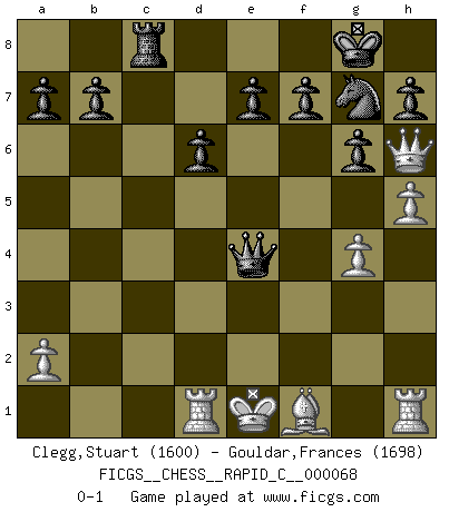 Last move : 0-1 2009 February 11 16:33:45 [Event "FICGS__CHESS__RAPID_C__000068"] [Site "FICGS"] [Date "2009.02.05"] [Round "1"] [White "Clegg,Stuart"] [Black "Gouldar,Frances"] [Result "0-1"] [WhiteElo "1600"] [BlackElo "1698"] 1.e4 c5 2.Nf3 d6 3.d4 cxd4 4.Nxd4 Nf6 5.Nc3 g6 6.f3 Bg7 7.Be3 Nc6 8.Qd2 Nxd4 9.Bxd4 O-O 10.O-O-O Be6 11.Kb1 Rc8 12.g4 Ne8 13.Bxg7 Nxg7 14.h4 Rc5 15.Qh6 Rxc3 16.bxc3 Qa5 17.Kc1 Rc8 18.h5 Qa3+ 19.Kd2 Qxc3+ 20.Ke2 Bxg4 21.fxg4 Qxc2+ 22.Ke1 Qxe4+ 0-1 Sicilian : Dragon variation Kingside Castling by player Black (move 9) Queenside Castling by player White (move 10) Player Black won this chess game. Follow this game move after move (download)Chess is above all, a fight ! (Emanuel Lasker) Wenn Spassky eine Figur opfert kannst du genauso gut aufgeben. Aber wenn Tal eine Figur opfert, spiel weiter. Er könnte noch eine weitere opfern, und dann ... wer weiß? (Miguel Najdorf) Nunca antes ha habido un jugador de Ajedrez con tal conocimiento a fondo de las complejidades del juego y una inmensa voluntad absolutamente indomable de ganar. Yo pienso que Fischer es el jugador mas grande que jamás haya existido. (Lisa Lane) Même un GMI sait rarement calculer sur plus de cinq coups une attaque à sacrifices. (Rudolf Spielmann) A good book on your shelf is a friend that turns its back on you and remains a friend. (Author unknown)