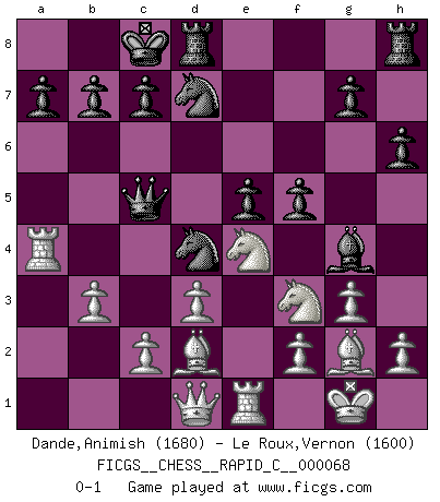 Last move : 0-1 2009 March 29 13:22:24 [Event "FICGS__CHESS__RAPID_C__000068"] [Site "FICGS"] [Date "2009.02.05"] [Round "1"] [White "Dande,Animish"] [Black "Le Roux,Vernon"] [Result "0-1"] [WhiteElo "1680"] [BlackElo "1600"] 1.e4 d5 2.exd5 Qxd5 3.Nc3 Qa5 4.Nf3 Bg4 5.g3 Nc6 6.Bg2 O-O-O 7.O-O e5 8.d3 Bb4 9.Bd2 Nf6 10.a3 Nd4 11.axb4 Qxb4 12.b3 h6 13.Ra4 Qc5 14.Re1 Nd7 15.Ne4 f5 0-1 This chess game has been lost on time (started : 2009.02.05 10:11:3) Scandinavian (centre counter) defense Queenside Castling by player Black (move 6) Kingside Castling by player White (move 7) Player Black won this chess game. Follow this game move after move (download)In order to improve your game, you must study the endgame before everything else, for whereas the endings can be studied and mastered by themselves, the middle game and the opening must be studied in relation to the endgame. (Jose Raul Capablanca) Über Frauen: Chess is better. (Robert James Fischer) El Rey es una pieza de pelea. ¡Usenlo!. (Wilhelm Steinitz) Je ne crois pas en la psychologie, je crois aux bons coups. (Robert Fischer) We need strong personalities and only one world champion to attract sponsors. (Anatoly Karpov)