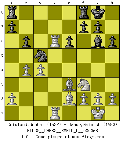 Last move : 1-0 2009 March 29 13:22:24 [Event "FICGS__CHESS__RAPID_C__000068"] [Site "FICGS"] [Date "2009.02.05"] [Round "1"] [White "Cridland,Graham"] [Black "Dande,Animish"] [Result "1-0"] [WhiteElo "1522"] [BlackElo "1680"] 1.e4 c6 2.d4 d5 3.Nc3 dxe4 4.Nxe4 Bf5 5.Ng3 e6 6.Nf3 Bg6 7.Be2 Bd6 8.O-O Nf6 9.c4 b6 10.Be3 Nbd7 11.Qd2 O-O 12.Rfd1 Ne4 13.Nxe4 Bxe4 14.Rac1 c5 15.dxc5 Nxc5 16.Qxd6 Qxd6 17.Rxd6 h6 18.Rcd1 Bg6 19.b4 1-0 This chess game has been lost on time (started : 2009.02.05 10:11:3) Caro-Kann : Classical variation Kingside Castling by player White (move 8) Kingside Castling by player Black (move 11) Player White won this chess game. Follow this game move after move (download)We don't really know how the game was invented, though there are suspicions. As soon as we discover the culprits, we'll let you know. (Bruce Pandolfini) Ich spiele 70 Eröffnungssysteme. (Viktor Kortschnoi) El Ajedrez, como la música, como el amor, tiene el poder de hacer feliz a la gente. (Siegbert Tarrasch) Botvinnik disait en comparant les échecs à la musique: Il existe une science dont le but est l'étude de l'acoustique et des sons. Mais il y a aussi un art qui se sert de l'océan des sons : c'est la musique. De toute évidence, il en est de même pour la pensée. La logique est l'étude des lois de la réflexion et les échecs reflètent, en tant qu'art, le côté logique de la réflexion, sous la forme d'images artistiques... Extrait de Fischer - Spassky, Reykjavik 1972 par Alexander & F. Wyndham (Ed. Solar), p 37. Sometimes it pays to stay in bed in Monday, rather than spending the rest of the week debugging Monday's code. (Dan Salomon)