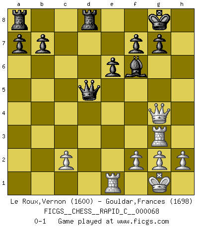 Last move : 0-1 2009 April 8 2:17:13 [Event "FICGS__CHESS__RAPID_C__000068"] [Site "FICGS"] [Date "2009.02.05"] [Round "1"] [White "Le Roux,Vernon"] [Black "Gouldar,Frances"] [Result "0-1"] [WhiteElo "1600"] [BlackElo "1698"] 1.d4 d5 2.Bf4 Bf5 3.e3 e6 4.Nf3 Nf6 5.Bd3 Bxd3 6.Qxd3 c6 7.O-O Nbd7 8.Nbd2 Be7 9.Rfe1 O-O 10.Ng5 h6 11.Be5 hxg5 12.Nf3 g4 13.Ng5 c5 14.Bxf6 Nxf6 15.e4 Nxe4 16.Nxe4 dxe4 17.Rxe4 cxd4 18.Rxd4 Qb6 19.Rxg4 Qxb2 20.Re1 Qxa2 21.Rg3 Rfd8 22.Qe4 Qd5 23.Qg4 Bf6 0-1 This chess game has been lost on time (started : 2009.02.05 10:11:3) Queen's pawn, Mason variation Kingside Castling by player White (move 7) Kingside Castling by player Black (move 9) Player Black won this chess game. Follow this game move after move (download)I won't play with you anymore. You have insulted my friend. - When an opponent cursed himself for a blunder. (Miguel Najdorf) Karpov ist ein Museumsstück. (Garry Kasparov) Si tu oponente no puede hacer nada activo, entonces no apures la posición; En vez de eso, dejalo estar sentado ahí, sufriendo y rogandote por un empate. (Jeremy Silman) Aux échecs, l'amour-propre est satisfait quand on remporte la victoire, mais il n'y a pas de honte à être battu. (Benjamin Franklin) There is far too much law for those who can afford it and far too little for those who cannot. (Derek Bok)