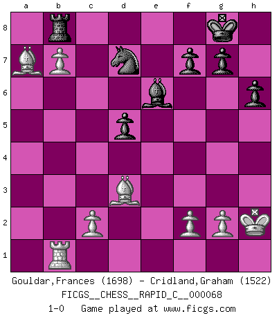Last move : 1-0 2009 February 17 23:56:5 [Event "FICGS__CHESS__RAPID_C__000068"] [Site "FICGS"] [Date "2009.02.05"] [Round "1"] [White "Gouldar,Frances"] [Black "Cridland,Graham"] [Result "1-0"] [WhiteElo "1698"] [BlackElo "1522"] 1.e4 c5 2.Nf3 Nc6 3.d4 cxd4 4.Nxd4 Qc7 5.Nxc6 bxc6 6.Nc3 e5 7.Bd3 Be7 8.O-O Nf6 9.Re1 O-O 10.Bg5 Re8 11.Qf3 Rb8 12.Rab1 d6 13.a3 Be6 14.b4 h6 15.Be3 d5 16.Qg3 Kh8 17.exd5 cxd5 18.Bd4 Nd7 19.Rxe5 Bd6 20.Nb5 Bxe5 21.Nxc7 Bxg3 22.Nxe8 Bxh2+ 23.Kxh2 Rxe8 24.Bxa7 Ra8 25.Bd4 Rxa3 26.b5 Ra8 27.b6 Rb8 28.b7 Kg8 29.Ba7 1-0 Sicilian : Flohr variation Kingside Castling by player White (move 8) Kingside Castling by player Black (move 9) Player White won this chess game. Follow this game move after move (download)I am still a victim of Chess. It has all the beauty of art and much more. It cannot be commercialized. Chess is much purer than art in its social position. (Marcel Duchamp) Offensichtlich kennt Kasparow nichts anderes als Schach, und ich könnte 500 weitere Spieler dieser Sorte benennen. (Judith Polgar) Con o sin el título, Bobby Fischer fue sin lugar a dudas el mas grande jugador de su época. (Burt Hochberg) Si je n'étais pas joueur d'échecs, je serais le meilleur dans quelque chose d'autre. (Anatoli Karpov) When I took office, only high energy physicists had ever heard of what is called the World Wide Web... Now even my cat has its own page. (Bill Clinton, 1996)