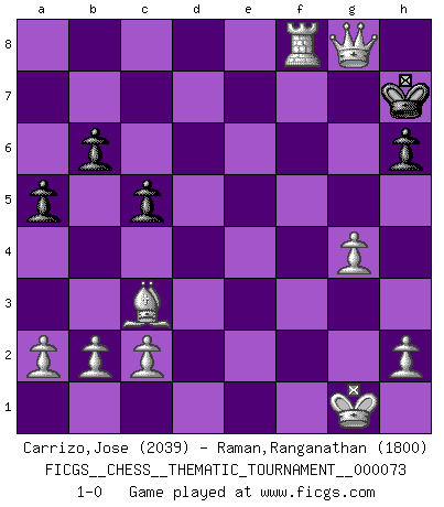 Last move : 1-0 2009 April 22 8:54:54 [Event "FICGS__CHESS__THEMATIC_TOURNAMENT__000073"] [Site "FICGS"] [Date "2009.02.05"] [Round "1"] [White "Carrizo,Jose"] [Black "Raman,Ranganathan"] [Result "1-0"] [WhiteElo "2039"] [BlackElo "1800"] 1.e4 e5 2.d4 exd4 3.f4 Nc6 4.Nf3 Nf6 5.e5 Ne4 6.Nbd2 d5 7.Bd3 Bf5 8.O-O Bb4 9.Nb3 Qe7 10.Nfxd4 Nxd4 11.Nxd4 O-O 12.Nxf5 Qe6 13.Bxe4 dxe4 14.Qd4 Qxf5 15.Qxb4 b6 16.Re1 c5 17.Qxe4 Qxe4 18.Rxe4 f5 19.exf6 Rxf6 20.Bd2 h6 21.Bc3 Rf7 22.Rae1 Kf8 23.g4 a5 24.f5 g5 25.fxg6 Rf3 26.g7+ Kg8 27.Re8+ Rxe8 28.Rxe8+ Rf8 29.Rxf8+ Kh7 30.g8Q+ 1-0 Halasz gambit Kingside Castling by player White (move 8) Kingside Castling by player Black (move 11) Promotion Queen by player White (move 30) Player White won this chess game. Follow this game move after move (download)Weak points or holes in the opponent's position must be occupied by pieces not Pawns. (Siegbert Tarrasch) Zu meiner Zeit war ein 20 jähriger ein junger Spieler, heute ist er ein Veteran. (Garry Kasparov) Si pudieramos observar el interior de la cabeza de un jugador de Ajedrez, encontraríamos ahí un mundo lleno de sentimientos, imágenes, ideas, emoción y pasión. (Alfred Binet) Votre seul travail dans les ouvertures est d'obtenir un milieu de partie jouable. (Lajos Portish) Unless in communicating with it one says exactly what one means, trouble is bound to result. (Alan Turing, about computers)
