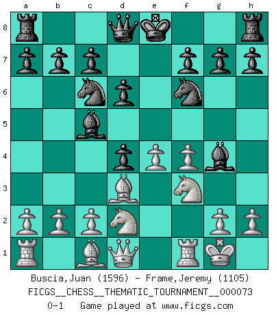 Last move : 0-1 2009 March 20 23:26:23 [Event "FICGS__CHESS__THEMATIC_TOURNAMENT__000073"] [Site "FICGS"] [Date "2009.02.05"] [Round "1"] [White "Buscia,Juan"] [Black "Frame,Jeremy"] [Result "0-1"] [WhiteElo "1596"] [BlackElo "1105"] 1.e4 e5 2.d4 exd4 3.f4 Bc5 4.Nf3 Nc6 5.Bd3 d6 6.O-O Nf6 7.Nbd2 Bg4 0-1 This chess game has been lost on time (started : 2009.02.05 22:11:33) Halasz gambit Kingside Castling by player White (move 6) Player Black won this chess game. Follow this game move after move (download)Chess, like love, like music, has the power to make people happy. (Siegbert Tarrasch) Man braucht nicht immer den besten Zug zu spielen: Ein Zug muß aktiv, unternehmungslustig, korrekt und schön sein. (David Bronstein) El Ajedrez, como la música, como el amor, tiene el poder de hacer feliz a la gente. (Siegbert Tarrasch) J'ai toujours senti une vague pitié pour l'homme qui ne connaît rien aux échecs, tout comme j'en aurais pour un homme ignorant de l'amour. Les Echecs, comme la musique ou comme l'amour, ont le pouvoir de rendre heureux. (Siegbert Tarrasch) I don't believe in psychology. I believe in good moves. (Bobby Fischer)