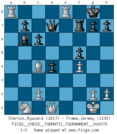 Last move : 1-0 2009 February 15 20:36:59 [Event "FICGS__CHESS__THEMATIC_TOURNAMENT__000073"] [Site "FICGS"] [Date "2009.02.05"] [Round "1"] [White "Sternik,Ryszard"] [Black "Frame,Jeremy"] [Result "1-0"] [WhiteElo "1817"] [BlackElo "1105"] 1.e4 e5 2.d4 exd4 3.f4 Bc5 4.Nf3 Nc6 5.a3 d6 6.b4 Bb6 7.Bd3 Bd7 8.b5 Nce7 9.O-O f5 10.e5 dxe5 11.Nxe5 Nh6 12.a4 O-O 13.Ba3 c6 14.a5 Bc7 15.Bc4+ Nf7 16.Nxf7 Rxf7 17.b6 axb6 18.axb6 Bxb6 19.Bxe7 Qxe7 20.Rxa8+ Be8 21.Re1 Qd7 22.R1xe8+ 1-0 Halasz gambit Kingside Castling by player White (move 9) Kingside Castling by player Black (move 12) Player White won this chess game. Follow this game move after move (download)No Chess Grandmaster is normal; they only differ in the extent of their madness. (Viktor Korchnoi) Bis zum Jahr 1971 verlief in meiner Schachkariere alles glatt. Dieses dramatische Match [Fischer-Taimanov 6:0] machte mein Leben zur Hölle. (Mark Taimanov) No hay otro maestro que tenga una voluntad terrífica de ganar. Al tablero, el irradía peligro y aún los oponentes mas fuertes tienden a congelarse como liebres cuando olfatean a una pantera. Aún sus debilidades son peligrosas. Con las blancas, su juego de apertura es predecible - te es posible hacer planes en su contra - pero es tan fuerte que tus planes casi nunca funcionan. En el juego medio, su precisión e invención son fabulosas y en finales, tú simplemente no le puedes vencer. (Experto Alemán anónimo) On croit qu'il y a plus de mauvais joueurs que de bons joueurs, c'est faux : Il y a autant de joueurs qui gagnent que de joueurs qui perdent. (Philippe Geluck) The weakness of an artist is dogma. (Josh Waitzkin)