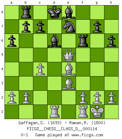 Last move : 0-1 2009 July 13 22:26:27 [Event "FICGS__CHESS__CLASS_D__000114"] [Site "FICGS"] [Date "2009.02.07"] [Round "1"] [White "Gaffagan,Steven"] [Black "Raman,Ranganathan"] [Result "0-1"] [WhiteElo "1693"] [BlackElo "1800"] 1.e4 Nc6 2.Nf3 e5 3.d4 f6 4.Bc4 Qe7 5.O-O a6 6.Nc3 h6 7.Nd5 Kd8 8.Nxe7 Bxe7 9.c3 Na5 10.Be2 d6 11.dxe5 Ke8 12.exd6 Bxd6 13.e5 fxe5 14.Nh4 Ne7 15.Bh5+ Kd8 16.Ng6 Nxg6 17.Bxg6 Nc6 18.Qh5 Bd7 19.Be3 Rf8 20.Rad1 Ne7 21.Be4 Rb8 22.c4 Be8 23.Qxe5 Rf6 0-1 This chess game has been lost on time (started : 2009.02.07 21:24:49) KP : Nimzovich defense Kingside Castling by player White (move 5) Player Black won this chess game. Follow this game move after move (download)You need not play well - just help your opponent to play badly. (Genrikh Chepukaitis) Ich verachte Kasparow. (Viktor Kortschnoi) Los tropiezos estan todos ahí en el tablero, esperando que se cometan. (Savielly Tartakover) Ce qui caractérise les parties de combat, c'est que si le défenseur a constamment de difficiles problèmes à résoudre, l'attaquant doit chercher sans relâche de nouvelles possibilités d'attaque. (Koblentz) Man with more than one clock never knows what time it is. (Chinese thought)
