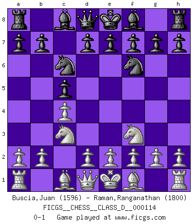Last move : 0-1 2009 March 22 11:31:45 [Event "FICGS__CHESS__CLASS_D__000114"] [Site "FICGS"] [Date "2009.02.07"] [Round "1"] [White "Buscia,Juan"] [Black "Raman,Ranganathan"] [Result "0-1"] [WhiteElo "1596"] [BlackElo "1800"] 1.c4 c5 2.Nc3 Nf6 3.Nf3 Nc6 0-1 This chess game has been lost on time (started : 2009.02.07 21:24:49) English : Symmetrical variation Player Black won this chess game. Follow this game move after move (download)He who takes the Queen's Knight's Pawn will sleep in the streets. (Anonymous) Die Neutralität betrachte ich als eine schwere Krankheit. (Viktor Kortschnoi) Un juego de Ajedrez es un dialogo, una conversación entre un jugador y su oponente. Cada movimiento del oponente puede contener amenazas o tropiezos, pero un jugador no se puede defender de las amenazas o tomar ventaja de los tropiezos si es que no se pregunta a sí mismo: ¿Que es lo que mi oponente va a hacer después de cada movida?. (Bruce A. Moon) Mais l'homme est une créature légère et illogique : semblable au joueur d'échecs, il n'aime que le processus du but à atteindre, non le but lui-même. (Dostoïevsky) Never was anything great achieved without danger. (Niccolo Machiavelli)