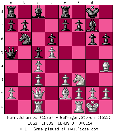 Last move : 0-1 2009 June 30 21:17:30 [Event "FICGS__CHESS__CLASS_D__000114"] [Site "FICGS"] [Date "2009.02.07"] [Round "1"] [White "Farr,Johannes"] [Black "Gaffagan,Steven"] [Result "0-1"] [WhiteElo "1525"] [BlackElo "1693"] 1.d4 Nf6 2.c4 g6 3.Nc3 Bg7 4.Nf3 O-O 5.Bg5 d6 6.e3 h6 7.Bh4 Nbd7 8.Qc2 c5 9.d5 Qa5 10.Be2 Ne4 11.Rc1 Nxc3 12.bxc3 Re8 13.O-O Nb6 0-1 King's Indian defense, 3.Nc3 Kingside Castling by player Black (move 4) Kingside Castling by player White (move 13) Player Black won this chess game. Follow this game move after move (download)Who is your opponent tonight, tonight I am playing against the Black pieces. (Akiba Rubinstein) Fallen sollten polizeilich verboten werden. (Savielly Grigorievitsch Tartakower) Si pudieramos observar el interior de la cabeza de un jugador de Ajedrez, encontraríamos ahí un mundo lleno de sentimientos, imágenes, ideas, emoción y pasión. (Alfred Binet) Je menace de comprendre la position. (Anonyme) I can't decide which is riskier; taking crazy risks, or taking advice on crazy risks from a crazy risk taker. (Gregory House in House M.D.)