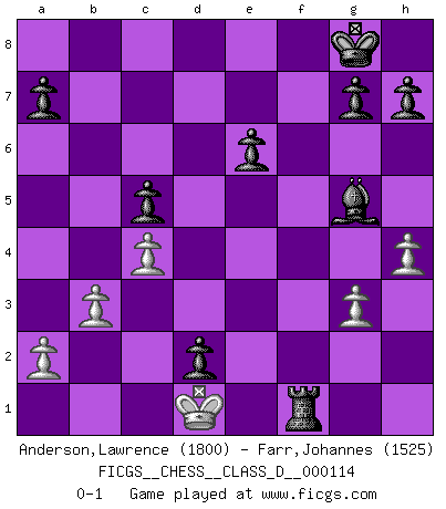 Last move : 0-1 2009 March 19 15:26:20 [Event "FICGS__CHESS__CLASS_D__000114"] [Site "FICGS"] [Date "2009.02.07"] [Round "1"] [White "Anderson,Lawrence"] [Black "Farr,Johannes"] [Result "0-1"] [WhiteElo "1800"] [BlackElo "1525"] 1.e4 e6 2.d4 d5 3.Nd2 Nf6 4.e5 Nfd7 5.f4 c5 6.b3 Nc6 7.Ngf3 cxd4 8.Bb2 Bc5 9.Bb5 O-O 10.Bxc6 bxc6 11.Bxd4 Be7 12.O-O c5 13.Bf2 f6 14.c4 fxe5 15.fxe5 d4 16.Re1 Bb7 17.Ne4 Qc7 18.Qd3 Nxe5 19.Nxe5 Qxe5 20.Bg3 Bxe4 21.Rxe4 Qf6 22.Rf1 Qxf1+ 23.Qxf1 Rxf1+ 24.Kxf1 Rf8+ 25.Rf4 Rxf4+ 26.Bf2 d3 27.g3 d2 28.Ke2 Rxf2+ 29.Kd1 Bg5 30.h4 Rf1+ 0-1 French : Tarrasch, Closed variation Kingside Castling by player Black (move 9) Kingside Castling by player White (move 12) Player Black won this chess game. Follow this game move after move (download)If your opponent offers you a draw, try to work out why he thinks he's worse off. (Nigel Short) Ein typischer, sehr verbreiteter Gedankenschädling ist der, daß der betreffende Amateur von der Annanhme ausgeht, daß jeder einzelne Zug etwas zu leisten habe. (Aaron Nimzowitsch) Solo el jugador con la iniciativa tiene el derecho a atacar. (Wilhelm Steinitz) La menace est plus forte que l'exécution. (Aaron Nimzovitch) The absolute truth is the thing that makes people laugh. (Carl Reiner)