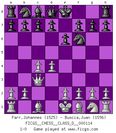 Last move : 1-0 2009 March 20 23:26:23 [Event "FICGS__CHESS__CLASS_D__000114"] [Site "FICGS"] [Date "2009.02.07"] [Round "1"] [White "Farr,Johannes"] [Black "Buscia,Juan"] [Result "1-0"] [WhiteElo "1525"] [BlackElo "1596"] 1.d4 Nf6 2.c4 e6 3.Nc3 Bb4 4.Qc2 Bxc3+ 5.Qxc3 1-0 This chess game has been lost on time (started : 2009.02.07 21:24:49) Nimzo-Indian : Classical variation Player White won this chess game. Follow this game move after move (download)Chess is a terrible game. If you have no center, your opponent has a freer position. If you do have a center, then you really have something to worry about ! (Siegbert Tarrasch) Kleine Schachspieler machen Mist, und große Schachspieler machen Mist, aber große machen weniger Mist. (Fritz Sämisch) Debemos de asegurarnos de que el Ajedrez no se convierta en un lenguaje muerto, muy interesante, pero solo para un grupo muy pequeño. (Sytze Faber) Il vaut mieux sacrifier les pièces de l'adversaire. (Xavier Tartacover) Watch your thoughts; they become words. Watch your words; they become actions. Watch your actions; they become habits. Watch your habits; they become character. Watch your character; it becomes your destiny. (Frank Outlaw)