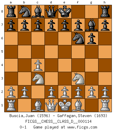 Last move : 0-1 2009 April 13 2:38:23 [Event "FICGS__CHESS__CLASS_D__000114"] [Site "FICGS"] [Date "2009.02.07"] [Round "1"] [White "Buscia,Juan"] [Black "Gaffagan,Steven"] [Result "0-1"] [WhiteElo "1596"] [BlackElo "1693"] 1.c4 g6 2.Nf3 Bg7 3.Nc3 Nf6 0-1 This chess game has been lost on time (started : 2009.02.07 21:24:49) English Opening Player Black won this chess game. Follow this game move after move (download)There just isn't enough televised Chess. (David Letterman) Ein Schachgenie ist jemand der verdammt gut Schach spielt. (Jonathan Levitt) Siempre es mejor sacrificar los hombres de tu oponente. (Savielly Tartakower) Le plus grand jeu de l'esprit jamais inventé, plus vous l'apprenez, plus vous y prenez du plaisir. (Garry Kasparov) Thibault, I ask for draw. Game 13876. - Sorry Ilmars, you won. (FICGS chat)