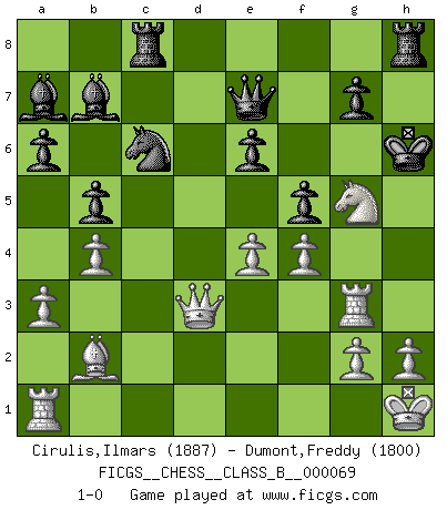 Last move : 1-0 2009 March 24 22:34:33 [Event "FICGS__CHESS__CLASS_B__000069"] [Site "FICGS"] [Date "2009.02.08"] [Round "1"] [White "Cirulis,Ilmars"] [Black "Dumont,Freddy"] [Result "1-0"] [WhiteElo "1887"] [BlackElo "1800"] 1.d4 Nf6 2.c4 c6 3.Nc3 d5 4.e3 e6 5.f4 Be7 6.Nf3 O-O 7.Bd3 c5 8.O-O Nc6 9.dxc5 Bxc5 10.a3 dxc4 11.Bxc4 a6 12.b4 Ba7 13.Qe2 Qc7 14.Kh1 b5 15.Bd3 Bb7 16.Bb2 Rac8 17.Ne4 Nxe4 18.Bxe4 Qe7 19.Bxh7+ Kxh7 20.Ng5+ Kg6 21.Rf3 f6 22.Rh3 Rh8 23.Qd3+ f5 24.Rg3 Kh6 25.e4 1-0 Queen's pawn game Kingside Castling by player Black (move 6) Kingside Castling by player White (move 8) Player White won this chess game. Follow this game move after move (download)Chess is above all, a fight ! (Emanuel Lasker) Dieses schreckliche Gefühl, dass ich gegen eine Maschine spielte, die niemals Fehler macht, zerschmetterte meinen Widerstand. (Mark Taimanov) El jugador blanco perdió porque fallo en recordar la coreccta continuación y tuvo que pensar por sí mismo las movidas. (Siegbert Tarrasch) Celui qui prend des risques peut perdre, celui qui n'en prend pas perd toujours. (Xavier Tartacover) There are three kinds of lies: lies, damned lies and statistics. (Mark Twain)