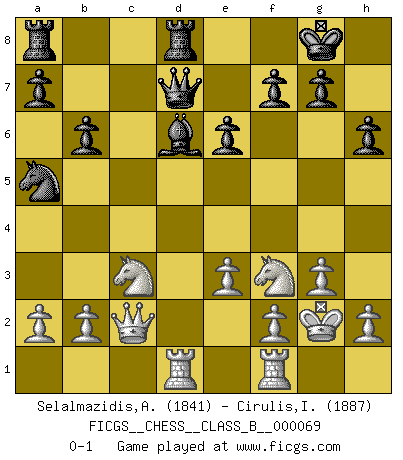 Last move : 0-1 2009 June 16 20:12:27 [Event "FICGS__CHESS__CLASS_B__000069"] [Site "FICGS"] [Date "2009.02.08"] [Round "1"] [White "Selalmazidis,Arsenis"] [Black "Cirulis,Ilmars"] [Result "0-1"] [WhiteElo "1841"] [BlackElo "1887"] 1.d4 d5 2.c4 e6 3.g3 Nf6 4.Bg2 c5 5.Nf3 dxc4 6.Qa4+ Nc6 7.dxc5 Bxc5 8.O-O O-O 9.Qxc4 b6 10.Nc3 Bb7 11.Bg5 Na5 12.Qa4 h6 13.Rad1 Qe7 14.Bxf6 Qxf6 15.Nd2 Qd4 16.Qc2 Bxg2 17.Kxg2 Rfd8 18.e3 Qd7 19.Nf3 Bd6 0-1 This chess game has been lost on time (started : 2009.02.08 14:2:15) Queen's gambit declined Kingside Castling by player White (move 8) Kingside Castling by player Black (move 8) Player Black won this chess game. Follow this game move after move (download)Chess is a fighting game which is purely intellectual and includes chance. (Richard Reti) Im Leben werden Partien nie so unstrittig gewonnen wie im Spiel (Emanuel Lasker) A través de las casillas del tablero, los Indios explican el movimiento del tiempo y la edad, las influencias mas altas que controlan el mundo y los lazos que vinculan al Ajedrez con el alma humana. (Al-Masudi) Des idées, des idées, j'en ai cent, j'en ai mille. Des bonnes, des mauvaises, applicables, irréalisables... Il suffit de faire le tri ! (Roos) The right perception of any matter and a misunderstanding of the same matter do not wholly exclude each other. (Kafka's the trial)