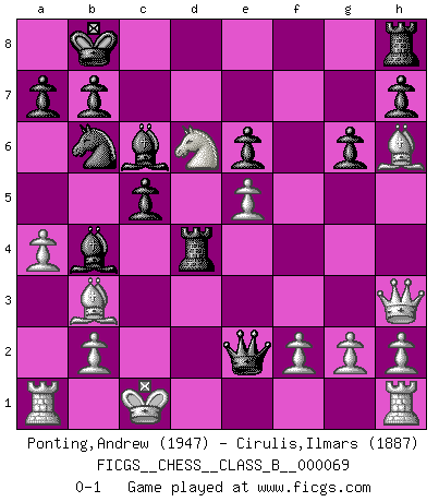 Last move : 0-1 2009 May 30 15:53:7 [Event "FICGS__CHESS__CLASS_B__000069"] [Site "FICGS"] [Date "2009.02.08"] [Round "1"] [White "Ponting,Andrew"] [Black "Cirulis,Ilmars"] [Result "0-1"] [WhiteElo "1947"] [BlackElo "1887"] 1.d4 d5 2.c4 e6 3.Nf3 c6 4.Nc3 dxc4 5.a4 Nf6 6.e4 Bb4 7.e5 Ne4 8.Qc2 Qa5 9.Qxe4 Bxc3+ 10.Kd1 Bb4 11.Bxc4 Nd7 12.Qg4 g6 13.Bh6 Nb6 14.Bb3 Qa6 15.Qe4 Bd7 16.Ng5 c5 17.Qf3 O-O-O 18.Nxf7 Bc6 19.Qh3 Rxd4+ 20.Kc1 Kb8 21.Nd6 Qe2 0-1 Queen's gambit declined Queenside Castling by player Black (move 17) Player Black won this chess game. Follow this game move after move (download)Best by test: 1. e4 (Bobby Fischer) Dein Körper muss in Topform sein. Dein Schach verfällt, wenn dein Körper verfällt. Der Körper kann nicht vom Geist getrennt werden. (Robert James Fischer) Es muy difícil jugar en contra de la teoría de Einstein. - en su primera derrota en contra de Fischer (Mikhail Tal) C'est la seule position que je connaisse où les deux camps sont mals. Propos prêtés à V. Anand. I would love to change the world, but they won't give me the source code. (Unknown)