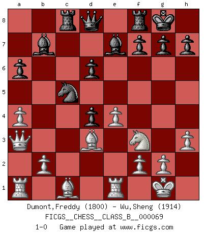 Last move : 1-0 2009 May 11 13:58:0 [Event "FICGS__CHESS__CLASS_B__000069"] [Site "FICGS"] [Date "2009.02.08"] [Round "1"] [White "Dumont,Freddy"] [Black "Wu,Sheng"] [Result "1-0"] [WhiteElo "1800"] [BlackElo "1914"] 1.e4 e5 2.Nf3 Nc6 3.Bb5 a6 4.Ba4 Nf6 5.O-O Be7 6.Re1 b5 7.Bb3 O-O 8.a4 b4 9.h3 d6 10.d4 Bb7 11.c3 Na5 12.Bc2 c5 13.cxb4 cxb4 14.Nbd2 Rc8 15.Bd3 Nd7 16.Nb3 Nxb3 17.Qxb3 exd4 18.Qxb4 Nc5 19.Qa3 1-0 This chess game has been lost on time (started : 2009.02.08 14:2:15) Ruy Lopez : Closed, 7...O-O Kingside Castling by player White (move 5) Kingside Castling by player Black (move 7) Player White won this chess game. Follow this game move after move (download)Fischer sacrificed virtually everything most of us weakies (to use his term) value, respect, and cherish, for the sake of an artful, often beautiful board game, for the ambivalent privilege of being its greatest master. (Paul Kollar) Mit sehr nachdenklichem Gesicht schreitet Bobby durch den Turniersaal. Was ist passiert?, fragt Lombardy. Ich stehe schlecht, antwortet Fischer. Lombardy: Dann biete doch einfach Remis an. Fischer: So schlecht stehe ich nun auch wieder nicht! (Robert James Fischer) No volvere nunca a jugar contigo. Has insultado a mi amigo. - cuando un oponente se maldijo por una mala jugada (Miguel Najdorf) Le jeu d'échecs fait naître et fortifie en nous plusieurs qualités précieuses dans le cours de l'existence, telles que la prévoyance, la circonspection, la prudence, et la persévérance. (Benjamin Franklin - 1783, la morale des échecs) You have to believe in yourself. (Sun Tzu)