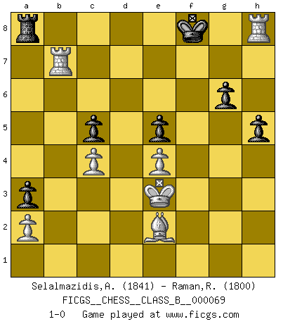 Last move : 1-0 2009 July 9 0:45:25 [Event "FICGS__CHESS__CLASS_B__000069"] [Site "FICGS"] [Date "2009.02.08"] [Round "1"] [White "Selalmazidis,Arsenis"] [Black "Raman,Ranganathan"] [Result "1-0"] [WhiteElo "1841"] [BlackElo "1800"] 1.d4 e6 2.e4 Nf6 3.e5 Ne4 4.Bd3 d5 5.Ne2 Nc6 6.f3 Qh4+ 7.g3 Nxg3 8.Nxg3 Nxd4 9.Be3 Nf5 10.Bxf5 c6 11.Bd3 d4 12.Bf2 Bb4+ 13.c3 dxc3 14.bxc3 Be7 15.Nf5 Qg5 16.Nxe7 Qxe5+ 17.Qe2 Qxe2+ 18.Bxe2 Kxe7 19.Rg1 g6 20.Nd2 b6 21.Ne4 Bb7 22.Bd4 Rhc8 23.Bf6+ Kf8 24.h4 c5 25.h5 a5 26.Rb1 Bd5 27.Rxb6 Kg8 28.c4 Bxe4 29.fxe4 a4 30.Kd2 a3 31.Rgb1 h6 32.hxg6 fxg6 33.Rb7 h5 34.Rg7+ Kf8 35.R1b7 Rd8+ 36.Bxd8 Rxd8+ 37.Ke3 e5 38.Rh7 Ra8 39.Rh8+ 1-0 Queen's pawn Player White won this chess game. Follow this game move after move (download)A player surprised is half beaten. (Proverb) Im Schach gibt es keinen Platz für Galanterie. (Irving Chernev) Durante una competencia de Ajedrez, un Maestro de Ajedrez deberá ser una combinación de presa de caza y un Monge. (Alexander Alekhine) J'ai vu le vaincu d'Echecs jouer des années durant dans l'espoir de la fête de la victoire. Car tu es plus riche de ce qu'elle existe si même elle n'est point pour toi. Ainsi de la perle du fond des mers. (Antoine de Saint-Exupéry) A cynic is a man who knows the price of everything but the value of nothing. (Oscar Wilde)