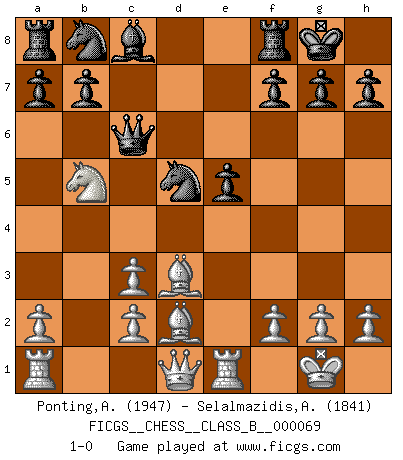 Last move : 1-0 2009 June 1 6:56:13 [Event "FICGS__CHESS__CLASS_B__000069"] [Site "FICGS"] [Date "2009.02.08"] [Round "1"] [White "Ponting,Andrew"] [Black "Selalmazidis,Arsenis"] [Result "1-0"] [WhiteElo "1947"] [BlackElo "1841"] 1.e4 c5 2.Nf3 e6 3.d4 cxd4 4.Nxd4 Nf6 5.Nc3 Bb4 6.e5 Nd5 7.Bd2 Bxc3 8.bxc3 O-O 9.Bd3 d6 10.exd6 Qxd6 11.O-O e5 12.Nb5 Qc6 13.Re1 1-0 This chess game has been lost on time (started : 2009.02.08 14:2:15) Sicilian : Pin, Koch variation Kingside Castling by player Black (move 8) Kingside Castling by player White (move 11) Player White won this chess game. Follow this game move after move (download)When asked, -How is that you pick better moves than your opponents?, I responded: I'm very glad you asked me that, because, as it happens, there is a very simple answer. I think up my own moves, and I make my opponent think up his. (Alexander Alekhine) Der Umstand, daß uns eine 7 Stunden Zeitkontrolle ermöglicht eine großartige, tiefe Partie zu spielen, ist für die Massenmedien nicht weiter von Bedeutung. (Alexej Shirov) Tu eres para mi la Reina en d8 y yo soy el Peón en d7!!. (GM Eduard Gufeld) A ce moment-là, je menaçais de comprendre la position ! (Clément L'Heureux) Experiences are the keys to life. (Daniel Parmet)