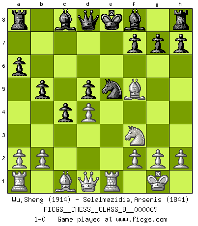 Last move : 1-0 2009 June 28 21:2:6 [Event "FICGS__CHESS__CLASS_B__000069"] [Site "FICGS"] [Date "2009.02.08"] [Round "1"] [White "Wu,Sheng"] [Black "Selalmazidis,Arsenis"] [Result "1-0"] [WhiteElo "1914"] [BlackElo "1841"] 1.d4 d5 2.c4 c6 3.Nc3 Nf6 4.Nf3 e6 5.e3 Nbd7 6.Bd3 dxc4 7.Bxc4 b5 8.Bd3 a6 9.e4 c5 10.e5 Nd5 11.Nxd5 exd5 12.O-O c4 13.Bf5 Nxe5 14.Re1 1-0 This chess game has been lost on time (started : 2009.02.08 14:2:15) QGD Slav defense Kingside Castling by player White (move 12) Player White won this chess game. Follow this game move after move (download)I won't play with you anymore. You have insulted my friend. - When an opponent cursed himself for a blunder. (Miguel Najdorf) Ich organisiere ein großes Turnier, was mich etwa 120000 Dollar kostet. Ich denke, das ist das erste Mal in der Schachgeschichte, daß ein Schachgroßmeister auch als Mäzen auftritt. (Miguel Najdorf) ¡Examina movidas que hagan daño! Un buen ojo for movidas desvastantes es mucho mas importante que el conocimiento de principios estratégicos. (Purdy) Echiquier : carré parfait, comme la Jérusalem nouvelle décrite par l'auteur de l'Apocalypse, huit cases sur huit, exaltation du chiffre 4, symbole du cosmos aux quatre horizons... où le noir et le blanc, l'ombre et la lumière, le mal et le bien s'entremêlent et se conjuguent. (Robert Couffignal, Le Gambit du poète) The production of too many useful things results in too many useless people. (Karl Marx)