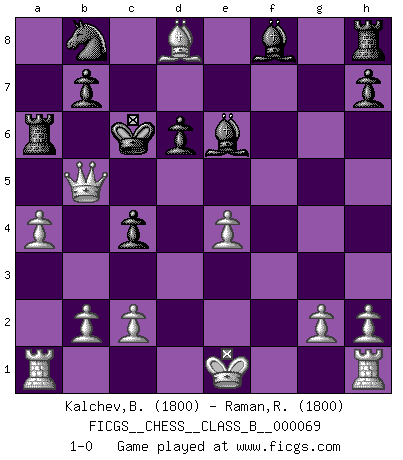 Last move : 1-0 2009 February 16 23:34:6 [Event "FICGS__CHESS__CLASS_B__000069"] [Site "FICGS"] [Date "2009.02.08"] [Round "1"] [White "Kalchev,Borislav"] [Black "Raman,Ranganathan"] [Result "1-0"] [WhiteElo "1800"] [BlackElo "1800"] 1.e4 e5 2.f4 exf4 3.Nf3 Nc6 4.d4 g5 5.d5 Nb8 6.Nc3 d6 7.Qd4 Nf6 8.Nxg5 c5 9.Qd1 Ng4 10.Bb5+ Ke7 11.Bxf4 a6 12.Ne6 fxe6 13.Qxg4 axb5 14.Bg5+ Ke8 15.Qh5+ Kd7 16.dxe6+ Kc7 17.Nxb5+ Kc6 18.Bxd8 Kxb5 19.Qe2+ c4 20.Qf2 Ra6 21.a4+ Kc6 22.Qf5 Bxe6 23.Qb5+ 1-0 King's knight's gambit Player White won this chess game. Follow this game move after move (download)It is peculiar but a fact nevertheless, that gamblers in chess always have enthusiastic followers. (Botvinnik) Wenn man heute mit 14 Jahren noch kein GM ist, kann man es vergessen. (Viswanathan Anand) Por esta medida (el intervalo entre Fischer y sus contemporaneos), yo le considero el mas grande campeón mundial. (Garry Kasparov) Les ravages du H expliquent la différence de niveau entre Tal et Thal [Abergel]. Don't be discouraged. It's often the last key in the bunch that opens the lock. (Author unknown)