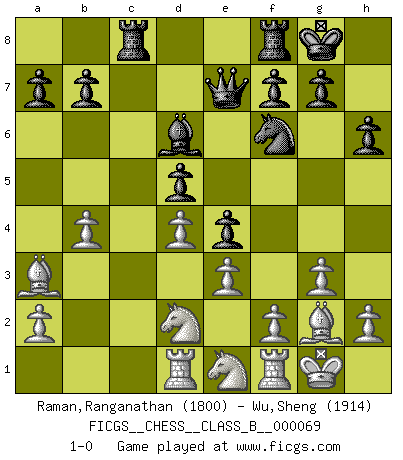 Last move : 1-0 2009 May 17 6:10:26 [Event "FICGS__CHESS__CLASS_B__000069"] [Site "FICGS"] [Date "2009.02.08"] [Round "1"] [White "Raman,Ranganathan"] [Black "Wu,Sheng"] [Result "1-0"] [WhiteElo "1800"] [BlackElo "1914"] 1.g3 d5 2.d4 Nf6 3.Nf3 e6 4.c3 Bd6 5.Bg2 O-O 6.Ng5 c5 7.b3 Nc6 8.O-O h6 9.Nf3 Bd7 10.Ba3 Qe7 11.Nbd2 Rac8 12.e3 e5 13.dxc5 Bxc5 14.b4 Bd6 15.Qa4 e4 16.Ne1 Nd4 17.Qd1 Bg4 18.cxd4 Bxd1 19.Rxd1 1-0 This chess game has been lost on time (started : 2009.02.08 14:2:15) Benko's Opening Kingside Castling by player Black (move 5) Kingside Castling by player White (move 8) Player White won this chess game. Follow this game move after move (download)A Chess game is divided into three stages: the first, when you hope you have the advantage, the second when you believe you have an advantage, and the third... when you know you're going to lose ! (Savielly Tartakower) Mit Schach schule ich mein Gefühl für Geometrie, was für Tennis und Schach gleichermaßen wichtig ist. (Boris Becker) Los libros de Ajedrez deben de usarse igual como usamos los anteojos: para mejorar la vista, aunque algunos jugadores los quieren usar como si ellos les otorgaran la vision. (José Raúl Capablanca) La guerre est enfant de la passion, la passion est enfant du narcissisme et le narcissisme est l'enfant. (...) Une autre partie ? (Thibault de Vassal) The arrogant army will lose certainly the battle. (Chinese proverb)