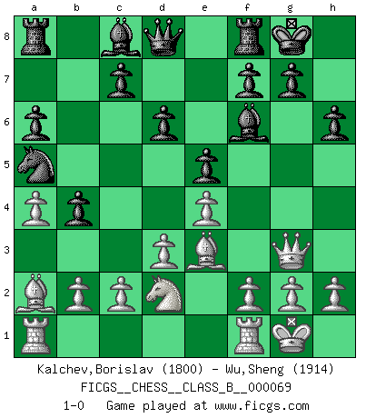 Last move : 1-0 2009 May 8 17:17:31 [Event "FICGS__CHESS__CLASS_B__000069"] [Site "FICGS"] [Date "2009.02.08"] [Round "1"] [White "Kalchev,Borislav"] [Black "Wu,Sheng"] [Result "1-0"] [WhiteElo "1800"] [BlackElo "1914"] 1.e4 e5 2.Nf3 Nc6 3.Bb5 a6 4.Ba4 Nf6 5.O-O b5 6.Bb3 Bb7 7.d3 Be7 8.Nc3 O-O 9.Be3 h6 10.a4 b4 11.Nd5 Nxd5 12.Bxd5 d6 13.Nd2 Na5 14.Ba2 Bf6 15.Qg4 Bc8 16.Qg3 1-0 This chess game has been lost on time (started : 2009.02.08 14:2:15) Ruy Lopez : Archangelsk (counterthrust) variation Kingside Castling by player White (move 5) Kingside Castling by player Black (move 8) Player White won this chess game. Follow this game move after move (download)There is only one thing Fischer does in Chess without pleasure: to lose ! (Boris Spassky) Jeder weiß, dass Gasprom Putins persönliches Machtinstrument ist. Die Firma wird vom Kreml aus geleitet und wird schon deshalb nie transparent sein. (Garry Kasparov) Los finales de Peón son del Ajedrez lo que el cesped es del Golf. (Cecil Purdy) Ne tendez aucun piège pour le plaisir ! Ne jouez rien dans l'espoir que l'adversaire réagisse de façon stupide ! Prenez toujours pour acquis que l'adversaire va trouver le meilleur coup ! Ne jouez jamais de coup dans l'espoir que l'adversaire ne voie pas la menace ! Chacun de vos coups doit améliorer la position d'une façon ou d'une autre. A good programmer is someone who always looks both ways before crossing a one-way street. (Doug Linder)