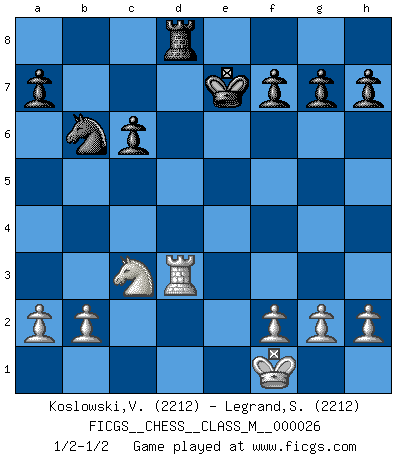 Last move : 1/2-1/2 2009 March 21 13:4:55 [Event "FICGS__CHESS__CLASS_M__000026"] [Site "FICGS"] [Date "2009.02.09"] [Round "1"] [White "Koslowski,Volker"] [Black "Legrand,Stephane"] [Result "1/2-1/2"] [WhiteElo "2212"] [BlackElo "2212"] 1.e4 c5 2.d4 cxd4 3.c3 Nf6 4.e5 Nd5 5.cxd4 Nc6 6.Nf3 d6 7.Bc4 Nb6 8.Bb5 dxe5 9.Nxe5 Bd7 10.Nxd7 Qxd7 11.Nc3 e6 12.O-O Be7 13.Qg4 O-O 14.Bxc6 bxc6 15.Bh6 Bf6 16.Rfd1 e5 17.Qxd7 Nxd7 18.Be3 exd4 19.Bxd4 Rfd8 20.Kf1 Kf8 21.Rab1 Bxd4 22.Rxd4 Nb6 23.Rbd1 Rxd4 24.Rxd4 Ke7 25.Rd3 Rd8 1/2-1/2 Sicilian : Smith-Morra gambit Kingside Castling by player White (move 12) Kingside Castling by player Black (move 13) This chess game ended in a draw. Follow this game move after move (download)Different people feel differently about resigning. (Bobby Fischer) Um sich vor der Gefahr einer Erkältung zu schützen, sorge der wanderlustige König beizeiten für ein brauchbares Versteck. (Aaron Nimzowitsch) Solo el jugador con la iniciativa tiene el derecho a atacar. (Wilhelm Steinitz) Le système Elo représente seulement une moyenne. Il est simplement un indicateur de votre stabilité. (Anatoli Karpov) Secret operations are essential in war; upon them the army relies to make its every move. (Sun Tzu)
