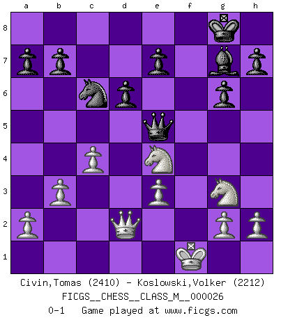 Last move : 0-1 2009 May 29 18:49:57 [Event "FICGS__CHESS__CLASS_M__000026"] [Site "FICGS"] [Date "2009.02.09"] [Round "1"] [White "Civin,Tomas"] [Black "Koslowski,Volker"] [Result "0-1"] [WhiteElo "2410"] [BlackElo "2212"] 1.e4 c5 2.Nf3 d6 3.Bb5+ Bd7 4.Bxd7+ Qxd7 5.c4 Nf6 6.Nc3 g6 7.d4 cxd4 8.Nxd4 Bg7 9.O-O O-O 10.Be3 Ng4 11.Qd2 Nc6 12.Nde2 f5 13.exf5 Rxf5 14.Ng3 Rf7 15.Nce4 Raf8 16.Rad1 Nxe3 17.fxe3 Rxf1+ 18.Rxf1 Rxf1+ 19.Kxf1 Qe6 20.b3 Qe5 0-1 Sicilian : Canal-Sokolsky attack, Sokolsky variation Kingside Castling by player White (move 9) Kingside Castling by player Black (move 9) Player Black won this chess game. Follow this game move after move (download)The most important feature of the Chess position is the activity of the pieces. This is absolutely fundamental in all phases of the game: Opening, Middlegame and especially Endgame. The primary constraint on a piece's activity is the Pawn structure. (Michael Stean) Wie kann ich Remis annehmen? Ich weiß ja gar nicht, wie ich stehe! (Fritz Sämisch) Haz el enroque temprano y seguido. (Rob Sillars) Le temps de noter son nom sur la feuille de partie, j'étais déjà en zeitnot ! D'un modeste amateur apparié lors de la première ronde d'un open contre le grand-maître Azmaïparashvili. Man is still the most extraordinary computer of all. (John F. Kennedy)