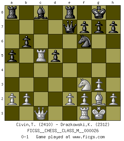 Last move : 0-1 2009 June 2 19:7:5 [Event "FICGS__CHESS__CLASS_M__000026"] [Site "FICGS"] [Date "2009.02.09"] [Round "1"] [White "Civin,Tomas"] [Black "Drazkowski,Krzysztof"] [Result "0-1"] [WhiteElo "2410"] [BlackElo "2312"] 1.d4 Nf6 2.c4 e6 3.g3 d5 4.Nf3 Be7 5.Bg2 O-O 6.O-O Nbd7 7.Nbd2 c5 8.cxd5 exd5 9.dxc5 Nxc5 10.Nb3 Nce4 11.Be3 Re8 12.Rc1 a5 13.Nc5 Nxc5 14.Bxc5 Bxc5 15.Rxc5 Qe7 16.Qc1 b6 0-1 Catalan Opening Kingside Castling by player Black (move 5) Kingside Castling by player White (move 6) Player Black won this chess game. Follow this game move after move (download)Chess is ruthless: you've got to be prepared to kill people. (Nigel Short) Habe Mut, dich deines eigenen Verstandes zu bedienen. (Immanuel Kant) Una mala movida nulifica cuarenta buenas. (Horowitz) Vous m'avez demandé de vous exposer quel est le fondement de la prière. Je ne fais que préparer les pièces du jeu sur la table... Nous sera-t-il permis d'en adopter les règles et si nous les appliquons scrupuleusement nous ne tarderons pas à faire mat le Roi divin ! Il ne pourra échapper à nos mains. (Sainte Thérèse d'Avila, Chemin de perfection) A clear conscience is usually the sign of a bad memory. (Unknown)
