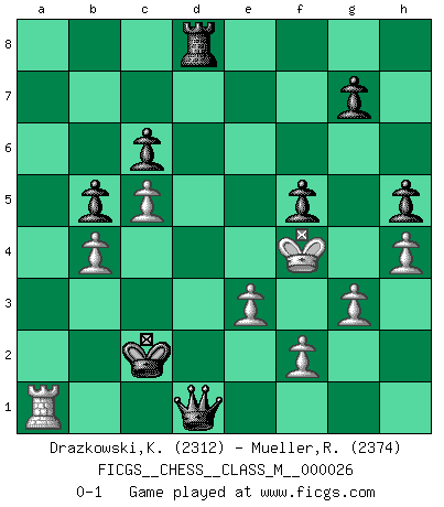 Last move : 0-1 2010 January 3 10:58:45 [Event "FICGS__CHESS__CLASS_M__000026"] [Site "FICGS"] [Date "2009.02.09"] [Round "1"] [White "Drazkowski,Krzysztof"] [Black "Mueller,Robert"] [Result "0-1"] [WhiteElo "2312"] [BlackElo "2374"] 1.d4 Nf6 2.c4 e6 3.Nf3 d5 4.cxd5 exd5 5.Bg5 h6 6.Bxf6 Qxf6 7.Nc3 c6 8.g3 Qd8 9.Bg2 Be6 10.O-O Be7 11.Qb3 Qb6 12.Qc2 Nd7 13.e3 O-O 14.a3 Rfe8 15.b4 a5 16.Na4 Qa7 17.Qc3 b5 18.Nc5 Nxc5 19.dxc5 Bf6 20.Nd4 Bf5 21.Qd2 Bxd4 22.Qxd4 Qb8 23.Rfe1 Qe5 24.Rad1 Bc2 25.Qxe5 Rxe5 26.Rd4 axb4 27.axb4 f5 28.h4 h5 29.Bf1 R5e8 30.Rd2 Bb3 31.Rb1 Bc4 32.Kg2 Kf7 33.Rdb2 Ra3 34.Be2 Bxe2 35.Rxe2 d4 36.Rd1 d3 37.Red2 Rd8 38.Kf3 Kf6 39.Rb1 Ke5 40.R2d1 Kd5 41.Ra1 Rxa1 42.Rxa1 Kc4 43.Rb1 Kc3 44.Kf4 d2 45.Rd1 Kc2 46.Ra1 d1Q 0-1 Queen's pawn game Kingside Castling by player White (move 10) Kingside Castling by player Black (move 13) Promotion Queen by player Black (move 46) Player Black won this chess game. Follow this game move after move (download)A chess genius has died; a loss for humanity. (Viktor Kortchnoi, about Bobby Fischer's death) Ich bin der einzige Schachspieler, der sich während der Vorbereitungen zum Turnier verletzt hat. (Woody Allen) Sin errores no puede haber brillantez. (Emanuel Lasker) La guerre est enfant de la passion, la passion est enfant du narcissisme et le narcissisme est l'enfant. (...) Une autre partie ? (Thibault de Vassal) Man with more than one clock never knows what time it is. (Chinese thought)