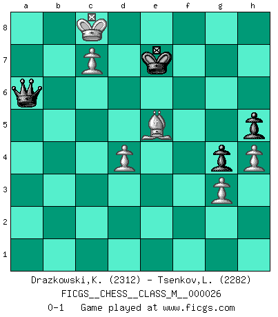 Last move : 0-1 2009 November 8 11:3:28 [Event "FICGS__CHESS__CLASS_M__000026"] [Site "FICGS"] [Date "2009.02.09"] [Round "1"] [White "Drazkowski,Krzysztof"] [Black "Tsenkov,Ljubomir"] [Result "0-1"] [WhiteElo "2312"] [BlackElo "2282"] 1.d4 Nf6 2.c4 e6 3.Nf3 d5 4.cxd5 exd5 5.Bg5 h6 6.Bh4 Bb4+ 7.Nc3 g5 8.Bg3 Ne4 9.Rc1 h5 10.h4 g4 11.Qa4+ Nc6 12.Ne5 Bd7 13.Qb3 Bxc3+ 14.Rxc3 Nxc3 15.bxc3 Nxe5 16.Bxe5 Rh6 17.Qxd5 Rb6 18.e4 Rb1+ 19.Kd2 c6 20.Qd6 Be6 21.Qxd8+ Kxd8 22.Bf6+ Kd7 23.a4 Bc4 24.Bxc4 Rxh1 25.e5 Ke8 26.g3 Ra1 27.Bb3 Rb8 28.c4 b5 29.axb5 a5 30.e6 Ra3 31.Bc2 cxb5 32.Be5 Rc8 33.exf7+ Kxf7 34.c5 b4 35.Be4 Rc3 36.Bd5+ Ke7 37.Bd6+ Kf6 38.Be4 a4 39.c6 Rc4 40.Kd3 a3 41.Kxc4 a2 42.Be5+ Ke6 43.Bd5+ Ke7 44.Kxb4 a1Q 45.c7 Qb2+ 46.Kc5 Qc3+ 47.Kb5 Rf8 48.Kb6 Rxf2 49.Bb7 Rb2+ 50.Ka7 Qa5+ 51.Kb8 Rxb7+ 52.Kxb7 Qb5+ 53.Kc8 Qa6+ 0-1 Queen's pawn game Promotion Queen by player Black (move 44) 10 pieces endgame at move 52 : White KBPPPP , Black KQPP WHITE : King + 1 Bishop 4 Pawns BLACK : King + 1 Queen 2 Pawns Player Black won this chess game. Follow this game move after move (download)Chess is the gymnasium of the mind. (Blaise Pascal) Obwohl ich vom Stil her kaum zu den Priestern der Schachkunst gezählt werde, halte ich Schach doch für eine Kunst. (Tigran Petrosjan) El poder defensivo de una pieza clavada, solamente es imaginario. (Aaron Nimzovich) Le système Elo représente seulement une moyenne. Il est simplement un indicateur de votre stabilité. (Anatoli Karpov) Better than a thousand days of diligent study is one day with a great teacher. (Japanese proverb)