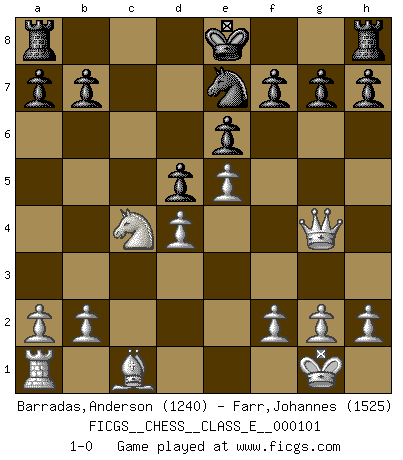 Last move : 1-0 2009 February 12 1:7:13 [Event "FICGS__CHESS__CLASS_E__000101"] [Site "FICGS"] [Date "2009.02.09"] [Round "1"] [White "Barradas,Anderson"] [Black "Farr,Johannes"] [Result "1-0"] [WhiteElo "1240"] [BlackElo "1525"] 1.e4 e6 2.d4 d5 3.e5 c5 4.c3 Nc6 5.Bb5 Bd7 6.Nf3 Qb6 7.Qe2 cxd4 8.Bxc6 Bxc6 9.Nxd4 Bc5 10.O-O Bxd4 11.cxd4 Bb5 12.Qg4 Bxf1 13.Kxf1 Qa6+ 14.Kg1 Qc4 15.Nd2 Ne7 16.Nxc4 1-0 French : Advance variation Kingside Castling by player White (move 10) Player White won this chess game. Follow this game move after move (download)Tactics flow from a superior position. (Bobby Fischer) Modernes Schach sorgt sich zuviel um Dinge wie Bauernstruktur usw. Vergessen Sie das, Schachmatt beendet das Spiel! (Nigel Short) Al jugar al Ajedrez entonces, podemos aprender: Primero: Previsión... Segundo: Prudencia... Tercero: Cautela... Y al final, aprendemos del Ajedrez el hábito de no ser desanimados por apariencias malas presentes en el estado de nuestros asuntos, el hábito de la esperanza por una oportunidad favorable y la perseveración de los secretos de los recursos. (Benjamin Franklin) Le temps de noter son nom sur la feuille de partie, j'étais déjà en zeitnot ! D'un modeste amateur apparié lors de la première ronde d'un open contre le grand-maître Azmaïparashvili. If I had no sense of humor, I would long ago have committed suicide. (Mahatma Gandhi)
