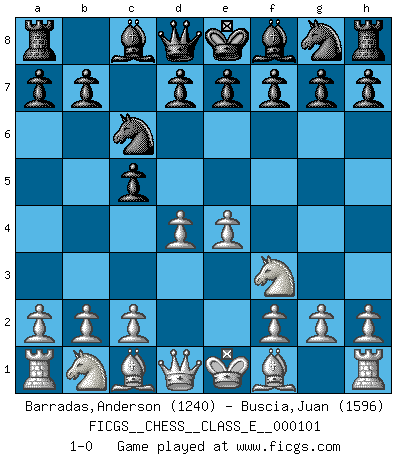 Last move : 1-0 2009 March 22 11:31:45 [Event "FICGS__CHESS__CLASS_E__000101"] [Site "FICGS"] [Date "2009.02.09"] [Round "1"] [White "Barradas,Anderson"] [Black "Buscia,Juan"] [Result "1-0"] [WhiteElo "1240"] [BlackElo "1596"] 1.e4 c5 2.Nf3 Nc6 3.d4 1-0 This chess game has been lost on time (started : 2009.02.09 21:48:55) Sicilian defense Player White won this chess game. Follow this game move after move (download)Chess is like life. (Boris Spassky) Ja, ich habe einmal eine Blitzpartie gespielt, es war in einem Zug, 1929. --im Interview 1989 (Mikhail Moiseyevich Botvinik) Si tu oponente te ofrece un empate, trata de averiguar porque piensa él que esta en una posición peor. (Nigel Short) J'ai toujours senti une vague pitié pour l'homme qui ne connaît rien aux échecs, tout comme j'en aurais pour un homme ignorant de l'amour. Les Echecs, comme la musique ou comme l'amour, ont le pouvoir de rendre heureux. (Siegbert Tarrasch) Internal peace cannot coexist with external war. (Don Groves)