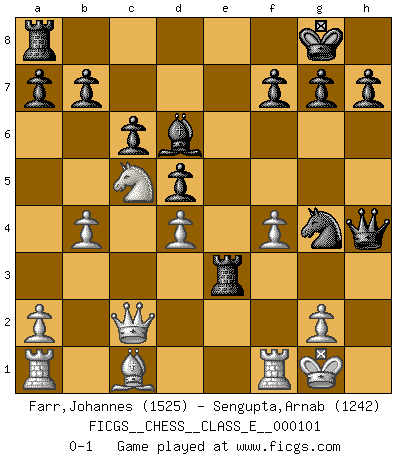 Last move : 0-1 2009 March 14 15:52:32 [Event "FICGS__CHESS__CLASS_E__000101"] [Site "FICGS"] [Date "2009.02.09"] [Round "1"] [White "Farr,Johannes"] [Black "Sengupta,Arnab"] [Result "0-1"] [WhiteElo "1525"] [BlackElo "1242"] 1.d4 d5 2.c4 c6 3.Nf3 Nf6 4.e3 Bg4 5.Qb3 Qb6 6.Ne5 Bf5 7.Bd3 Bxd3 8.Nxd3 e6 9.Nc3 Nbd7 10.cxd5 exd5 11.Qc2 Bd6 12.O-O O-O 13.b3 Rfe8 14.Na4 Qc7 15.Nac5 Bxh2+ 16.Kh1 Nxc5 17.Nxc5 Bd6 18.Ba3 Qc8 19.b4 Qg4 20.f4 Rxe3 21.Bc1 Qh4+ 22.Kg1 Ng4 0-1 QGD Slav : 4.e3 Kingside Castling by player White (move 12) Kingside Castling by player Black (move 12) Player Black won this chess game. Follow this game move after move (download)Look at Garry Kasparov. After he loses, invariably he wins the next game. He just kills the next guy. That's something that we have to learn to be able to do. (Maurice Ashley) Du weisst es gibt ein Problem mit Computern und Fernschach, wenn jeder eine Rating von 2450 hat. (John Christen Knudsen) Diferente gente reacciona diferentemente en aceptar la derrota. (Bobby Fischer) Des combinaisons [dans le jeu d'échecs] pareilles à des mélodies. Je crois entendre pour ainsi dire la musique des coups... (Vladimir Nabokov) The faster the computer, the slower the brain. (Thibault de Vassal)