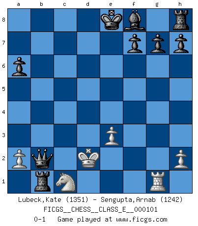 Last move : 0-1 2009 March 24 22:4:42 [Event "FICGS__CHESS__CLASS_E__000101"] [Site "FICGS"] [Date "2009.02.09"] [Round "1"] [White "Lubeck,Kate"] [Black "Sengupta,Arnab"] [Result "0-1"] [WhiteElo "1351"] [BlackElo "1242"] 1.c4 e6 2.e4 d5 3.exd5 exd5 4.cxd5 Nf6 5.Qa4+ c6 6.dxc6 Nxc6 7.Bb5 Bd7 8.Nf3 a6 9.Bxc6 Qe7+ 10.Kf1 Bxc6 11.Qb3 Qe4 12.d3 Qf5 13.Nd4 Bxg2+ 14.Kxg2 Qg4+ 15.Kf1 Qxd4 16.Be3 Qd7 17.Qb6 Qxd3+ 18.Kg2 Qg6+ 19.Kf1 Qe4 20.Rg1 Nd5 21.Qxb7 Nxe3+ 22.fxe3 Qxb7 23.Nd2 Qxb2 24.Nb3 Rb8 25.Nc1 Qxa1 26.Ke2 Rb1 27.Kd2 Qb2+ 0-1 English Opening Player Black won this chess game. Follow this game move after move (download)Whoever sees no other aim in the game than that of giving checkmate to one's opponent will never become a good Chess player. (Euwe) Ein Springer auf f6 gegen die eigene Rochadestellung ist schlimmer als ein rostiger Nagel im Knie. (Efim Bogoljubov) Creo que una cierta cantidad de temperamento es esperada de los genios del Ajedrez. (Ron Gross) Que feriez-vous si vous étiez en train de jouer aux échecs et que la fin du monde arrive ? Je continuerais à jouer. (Saint Borromée) Depression is just anger without enthusiasm. (Unknown)