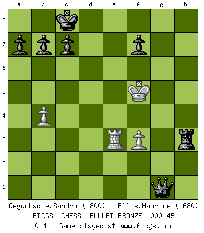 Last move : 0-1 2009 October 6 22:21:50 [Event "FICGS__CHESS__BULLET_BRONZE__000145"] [Site "FICGS"] [Date "2009.10.06"] [Round "1"] [White "Geguchadze,Sandro"] [Black "Ellis,Maurice"] [Result "0-1"] [WhiteElo "1800"] [BlackElo "1680"] 1.e4 e6 2.d4 d5 3.Nc3 dxe4 4.Nxe4 e5 5.dxe5 Qxd1+ 6.Kxd1 Nc6 7.Bf4 Nge7 8.Bc4 Ng6 9.Bg3 Ngxe5 10.Bb5 Bf5 11.Bxe5 O-O-O 12.Ke2 Bxe4 13.Bxc6 Bxc6 14.Bc3 Bxg2 15.Nf3 Re8+ 16.Kd2 Bxf3 17.Rhe1 Bd6 18.h3 Bf4+ 19.Kd3 Rxe1 20.Rxe1 Rd8+ 21.Kc4 Bd5+ 22.Kb5 Bxa2 23.b3 Bd2 24.Bxd2 Rxd2 25.Kb4 Rxc2 26.f3 Rf2 27.Re3 Bb1 28.Re8+ Kd7 29.Re3 Bf5 30.h4 Be6 31.Kc3 Rh2 32.Re4 Rh3 33.Rf4 h6 34.b4 g5 35.hxg5 hxg5 36.Rd4+ Kc8 37.Rd3 Bf5 38.Re3 g4 39.Kd4 g3 40.Ke5 g2 41.Kxf5 g1Q 0-1 Comment by player 2 : Maurice Ellis : An ELLIS GAMBIT example French : Rubinstein variation Queenside Castling by player Black (move 11) Promotion Queen by player Black (move 41) Player Black won this chess game. Follow this game move after move (download)There are two types of sacrifices: correct ones and mine. (Mikhail Tal) Wenn sie aufgeben, dann danke ich Ihnen für das Spiel (Eventualzug beim Fernschach). (Anonymous) Debemos de asegurarnos de que el Ajedrez no se convierta en un lenguaje muerto, muy interesante, pero tan solo para un grupo muy pequeño. (Sytze Faber) Vouloir jouer aux échecs contre soi-même est aussi paradoxal que vouloir marcher sur son ombre. (Stefan Zweig) Knowledge will give you power, but character respect. (Bruce Lee)