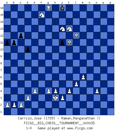 Last move : 1-0 2009 July 9 0:46:20 [Event "FICGS__BIG_CHESS__TOURNAMENT__000035"] [Site "FICGS"] [Date "2009.02.10"] [Round "1"] [White "Carrizo,Jose"] [Black "Raman,Ranganathan"] [Result "1-0"] [WhiteElo "1739"] [BlackElo ""] 1.k2-k4 j15-k13 2.l2-l4 e15-e14 3.m2-m4 h16-l13 4.l4-l5 p16-o14 5.p1-o3 h15-g13 6.j2-l3 o14-m13 7.n2-n4 m13-k14 8.g2-g4 b16-c14 9.d2-d3 c14-e13 10.b1-c3 e13-g14 11.h1-e4 g16-f14 12.e4-c4 c15-c14 13.c4-o15 q15-q13 14.l1-o4 k13-m14 15.o15-h9 l13-o10 16.h9-j9 o10-f2 17.g1-f3 f2-a7 18.j9-l7 a7-l7 19.o4-l7 m14-k13 20.h3-h4 k16-l14 21.m4-m5 j14-j13 22.f1-o9 k13-h12 23.c1-o12 n15-n13 24.o12-q10 p15-p13 25.e1-f1 q13-q12 26.f3-g5 m15-m14 27.e2-e4 f16-e15 28.f1-f3 f14-h13 29.a1-f1 h12-j14 30.q2-q4 p13-p12 31.q1-q3 p12-p11 32.q10-n7 f15-f14 33.q3-p3 o16-q14 34.m5-m6 e16-h16 35.o9-n8 j13-j12 36.o1-e10 h13-g11 37.l7-g11 g13-e12 38.g11-e9 g14-f12 39.f3-f12 e12-g11 40.e9-g11 g15-g13 41.f12-f7 l16-n14 42.f7-l7 h14-h13 43.k1-m2 q16-o16 44.m2-l4 h13-h12 45.g11-k8 q14-k8 46.l7-l8 k8-g11 47.m1-m5 n14-j10 48.l8-l9 j14-l13 49.m5-q5 g13-g12 50.q5-q12 o16-p16 51.l9-p9 f14-f13 52.p9-p11 j10-n6 53.p11-p16 n6-l4 54.e10-l4 j16-j15 55.q12-q16 b15-b13 56.p16-m16 h16-m16 57.q16-m16 l14-m16 58.p3-p16 c16-b15 59.q4-q5 c14-c13 60.l4-m5 d15-d13 61.q5-q6 a16-h16 62.q6-q7 k14-m15 63.j1-j2 j12-j11 64.q7-q8 m15-o14 65.p16-q16 e15-f16 66.q8-q9 o14-n12 67.m5-j8 n12-o10 68.n8-o7 f16-p7 69.h2-j4 b13-b12 70.q9-q10 b15-a14 71.q10-q11 l13-m11 72.n7-p9 k15-k14 73.q11-q12 n13-n12 74.q12-q13 m14-m13 75.q13-q14 g11-j9 76.q16-p16 j9-k10 77.p9-o10 m11-o10 78.p16-p7 m16-o15 79.f1-q1 h16-q16 80.q14-q15 a14-g8 81.o7-f15 o15-m14 82.f15-e14 d13-d12 83.e14-f13 m13-m12 84.f13-g12 m12-m11 85.g12-f11 a15-a13 86.j8-h9 g8-l4 87.j2-h3 o10-n8 88.p7-p16 n8-o6 89.p16-q16 k10-q16 90.q1-q13 k14-k13 91.j4-k6 l4-o1 92.o3-m2 o1-p2 93.q13-q2 p2-n4 94.m2-n4 o6-n4 95.l3-n4 m14-n16 96.k6-l8 n12-n11 97.q2-q11 l15-l14 98.q11-n11 n16-o14 99.n11-m11 o14-q15 100.m11-m15 j15-k14 101.m15-q15 q16-l11 102.g5-h7 k14-j13 103.h7-k8 j13-k14 104.k8-j10 l11-j13 105.l8-j9 a13-a12 106.j9-k11 h12-h11 107.k11-j13 h11-j10 108.j13-h15 k14-l13 109.h9-j10 a12-a11 110.o2-o4 k13-k12 111.c3-d5 l13-m12 112.n4-o6 m12-l11 113.o6-n8 l11-k10 114.f11-h9 k12-k11 115.j10-k11 l14-l13 116.d5-f6 k10-l11 117.f6-h7 l13-l12 118.k11-l12 c13-c12 119.h7-k8 d12-d11 120.q15-q10 l11-k12 121.h9-k11 b12-b11 122.k8-j10 k12-l13 123.n8-l9 l13-m12 124.q10-q11 m12-n12 125.j10-l11 n12-m12 126.l9-n10 m12-l13 127.q11-q13 l13-m14 128.l11-n12 m14-l14 129.q13-q14 l14-k15 130.n12-l13 k15-j15 131.l13-j12 j15-h16 132.j12-g13 h16-g15 133.q14-g14 g15-h16 134.n10-m12 h16-j15 135.m12-k13 j15-h16 136.h15-j13 d11-d10 137.g13-f15 h16-j16 138.g14-g16 1-0 Follow this game move after move (download)I have never in my life played the French Defence, which is the dullest of all openings. (Wilhelm Steinitz) Jeder leidlich begabte Spieler, er braucht keineswegs hervorragend veranlagt zu sein, kann es zum Meister bringen. Aber das ist ja auch gar nicht nötig! Der richtige Standpunkt ist es, zu seinem Vergnügen zu spielen, und man glaube ja nicht, dass der Genuss proportional dem Können sei. (Siegbert Tarrasch) Coloca el contenido de las piezas del Ajedrez en un sombrero, agitalo vigorosamente, arrojalas en un tablero desde una altura de 30 centimetros y así obtendras el estilo de Steinitz. (H. E. Bird) Les échecs, c'est l'imagination. (David Bronstein) Optimism is a variety of information deficit. Sometimes especially true for correspondence chess games. (Michael Aigner)