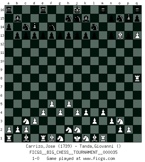 Last move : 1-0 2009 March 8 18:58:23 [Event "FICGS__BIG_CHESS__TOURNAMENT__000035"] [Site "FICGS"] [Date "2009.02.10"] [Round "1"] [White "Carrizo,Jose"] [Black "Tanda,Giovanni"] [Result "1-0"] [WhiteElo "1739"] [BlackElo ""] 1.g2-g4 g15-g13 2.f2-f4 h16-d12 3.n2-n3 f15-f13 4.b1-c3 g16-f14 5.d2-d3 b15-b14 6.h1-b7 c16-b15 7.b7-f7 d12-p12 8.p1-o3 p12-n14 9.f7-n14 m15-n14 10.m2-m4 p15-p14 11.l2-l3 o16-p15 12.e2-e4 p16-q14 13.k2-k4 e15-e13 14.h3-h4 l15-l13 15.q2-q4 d15-d13 16.q4-q5 k16-l14 17.j3-j4 c15-c13 18.h4-h5 k15-k13 19.q5-q6 b16-c14 20.q6-q7 f16-d14 21.q7-q8 l16-k15 22.q8-q9 o15-o13 23.q9-q10 q14-o15 24.q10-q11 n14-n13 25.q11-q12 a15-a14 26.o1-h7 b14-b13 27.q12-q13 j14-j13 28.f4-f5 h14-h13 29.q1-q8 p14-p13 30.h7-o13 1-0 Follow this game move after move (download)The laws of Chess do not permit a free choice: you have to move whether you like it or not. (Emanuel Lasker) Schach ist ein schwarz-weisser Dschungel. (Garry Kasparov) Del Ajedrez se ha dicho que la vida no es lo suficientemente larga para él, pero eso es culpa de la vida, no del Ajedrez. (William Ewart Napier) Les Echecs ne sont pas pour les âmes timides. Ils requièrent un homme entier, qui ne s'arrête pas aveuglément à ce qui a été déjà établi, mais qui tente individuellement de sonder les profondeurs du jeu. (W. Steinitz) Shallow men believe in luck. Strong men belive in cause and effect. (Ralph Waldo Emerson)