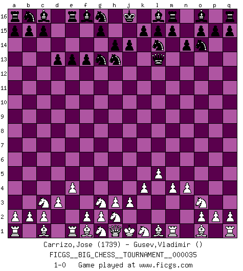 Last move : 1-0 2009 March 24 11:49:55 [Event "FICGS__BIG_CHESS__TOURNAMENT__000035"] [Site "FICGS"] [Date "2009.02.10"] [Round "1"] [White "Carrizo,Jose"] [Black "Gusev,Vladimir"] [Result "1-0"] [WhiteElo "1739"] [BlackElo ""] 1.n2-n4 e15-e13 2.m2-m4 j15-h13 3.p1-o3 h15-g13 4.j2-g3 p16-o14 5.b1-c3 d15-d13 6.e2-e4 n15-n14 7.d2-d3 k16-l14 8.l2-l4 h16-l13 9.k2-k4 f15-f13 10.l4-l5 1-0 This big chess game has been lost on time (started : 2009.02.10 17:31:14) Follow this game move after move (download)Chess is like war on a board. (Bobby Fischer) Ich kämpfe solange mein Gegner einen Fehler machen kann. (Emanuel Lasker) Debió haber existido una vez en que los hombres eran semidióses, de otra manera no hubiesen podido inventar el Ajedrez. (Gustav Schenk) Des combinaisons [dans le jeu d'échecs] pareilles à des mélodies. Je crois entendre pour ainsi dire la musique des coups... (Vladimir Nabokov) It's not enough to succeed. Others must fail. (Gore Vidal)