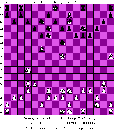 Last move : 1-0 2009 April 26 22:50:34 [Event "FICGS__BIG_CHESS__TOURNAMENT__000035"] [Site "FICGS"] [Date "2009.02.10"] [Round "1"] [White "Raman,Ranganathan"] [Black "Krug,Martin"] [Result "1-0"] [WhiteElo ""] [BlackElo ""] 1.b2-b3 b15-b14 2.p2-p4 c16-b15 3.o2-o3 p16-o14 4.p1-q3 n15-n14 5.c1-b2 k15-k13 6.j2-k4 j15-h13 7.g1-f3 l15-l13 8.m2-m3 m15-m13 9.n2-n4 l13-l12 10.l1-o4 d15-d14 11.e2-e3 k16-l14 12.f1-c4 e15-e13 13.m3-m4 f15-f13 14.h2-j4 m13-m12 15.o1-l4 h16-k14 16.b2-d4 b16-d15 17.b1-c3 g16-f14 18.c3-a4 f14-g12 19.d4-b6 l14-j13 20.d2-d4 o16-d6 21.g2-g3 b15-j8 22.e3-e4 f16-e15 23.e4-e5 d6-a9 24.c2-c3 j8-e4 25.e1-e4 l16-k15 26.l4-q9 o14-m13 27.f3-g5 e15-l9 28.g5-h7 o15-o13 29.h1-l4 l9-g13 30.h7-g9 g13-e11 31.l4-f9 a9-d12 32.g9-h11 f13-f12 33.h11-j13 g12-j13 34.l2-l3 d15-f14 35.f9-p9 p15-p14 36.b6-d8 n14-n13 37.a4-b6 e11-f10 38.d8-f10 d12-f10 39.p9-b9 j13-g12 40.b6-d7 n13-n12 41.q3-o2 h13-j11 42.e4-g4 j14-j13 43.o4-p5 j16-h16 44.c4-d5 h15-g13 45.b9-c9 e16-c16 46.c9-j9 1-0 Follow this game move after move (download)Fischer sacrificed virtually everything most of us weakies (to use his term) value, respect, and cherish, for the sake of an artful, often beautiful board game, for the ambivalent privilege of being its greatest master. (Paul Kollar) Es ist im Leben wie im Schachspiel. Wir entwerfen einen Plan, dieser bleibt jedoch bedingt durch das, was im Schachspiel dem Gegner, im Leben dem Schicksal zu tun belieben wird. (Arthur Schopenhauer) Con el tiempo, empecé a progresar en partidas decisivas. Tal vez porque me di cuenta de una simple verdad: no solo estaba yo nervioso sino también mi oponente. (Mikhail Tal) La vie est comme un jeu d'échecs : nous esquissons un plan, mais celui-ci est tributaire de ce que daignent faire l'adversaire aux échecs et le destin dans la vie. (Arthur Schopenhauer) He who is a good ruler must first have been ruled. (Aristotle)