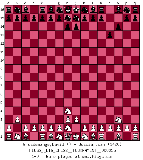 Last move : 1-0 2009 March 14 22:47:18 [Event "FICGS__BIG_CHESS__TOURNAMENT__000035"] [Site "FICGS"] [Date "2009.02.10"] [Round "1"] [White "Grosdemange,David"] [Black "Buscia,Juan"] [Result "1-0"] [WhiteElo ""] [BlackElo "1420"] 1.b2-b3 n15-n13 2.j2-h4 o15-o14 3.p1-o3 1-0 This big chess game has been lost on time (started : 2009.02.10 17:31:14) Follow this game move after move (download)Chess is a more highly symbolic game, but the aggressions are therefore even more frankly represented in the play. It probably began as a war game; that is, the representation of a miniature battle between the forces of two kingdoms. (Karl Meninger) Ja, jede Frau in Holland liebt mich bestimmt, und alle Männer hassen mich. (Loek van Wely) El Ajedrez es realmente noventa y nueve por ciento calculación. (Soltis) Je fais ceci parce que dans cinquante coups j'obtiendrai cela; je m'appelle Mikhail Moisevitch Botvinnik. (Botvinnik) Whatever you do, don't be bored. This is absolutely the most exciting time we could have possibly hoped to be alive. And things are just starting. (From movie Waking life)
